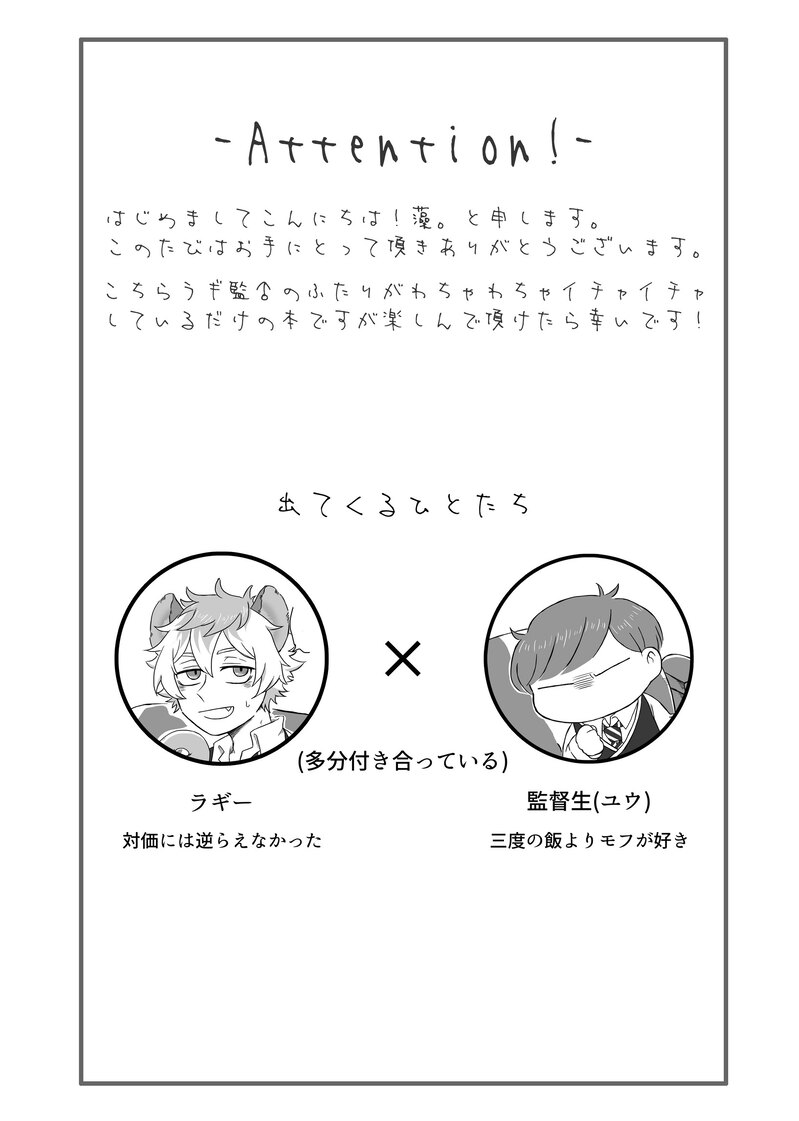 mo。☆こそフォロ過去のを晒す2021年に発行したラギ監♂本の再録です。全年齢すけべを描きたかったんや…… すべて表示(+16枚) タップで全画面(原寸:1638x2297)無断転載禁止 リアクションをたくさん送って応援しよう! よく使う人気おやつその他支払処理中 作者からのリプライ 気になる人をどんどんフォローしよう!☆こそフォロ mo。過去のを晒す2021年に発行したラギ監♂本の再録です。全年齢すけべを描きたかったんや…… 17 mo。過去のを晒す2023年発行のサバ監♂アンソロ2『鯖缶-water2-』に参加させて頂いたまんがのweb再録ですちょっとだけすけべ! 10 mo。過去のを晒す2022年発行のサバ監♂アンソロ『鯖缶』に参加させて頂いたまんがのweb再録です外堀を埋める策士なラギくんが描きたかった記憶がある…… 11 mo。過去のを晒す以前ラギ誕記念本のゲストに呼んで頂いた際のラギ監♂です。甘〜い 4 mo。ネタバレ監督生4年目BDのお祝いボイスのネタバレという名の感想(妄想)⚠️強めの監督生受けの幻覚です勢いのまま吐き出さざるを得ませんでした。パッション!!! 8 mo。できた性癖パネルトラップ①酩酊状態+キスハメ(ラギ監♂)※監くんがちょっと開眼します18歳以上?(y/n) 9 おすすめ作品 persona1icetwstかきかけラギ監がアイス食べてるだけ 6 はてんらくがきラギ監(顔有り)@過去絵 3 kabeuchinonicoらくがきいちゃらぶっち llltz1らくがき目が合う🐆監♀ purple_brassicaできたたんぽけ無配です。夢小説+R-18につき苦手な方は閲覧をご遠慮ください。18歳未満の方の閲覧は固くお断りします。pass→あなたは18歳以上ですか?(アルファベット3文字) 4713 あずみできたラギ監♀で よその子コレクション1枚目 秀好さんち @HideyoPP 2枚目 茉莉花さんち @maritsuka_ma 3枚目 ましろさんち @Ma410ro4枚目 瑶いちさんち @55ura_maru 5枚目 久雨さんち @kuuyumekaki6枚目 華月凛さんち @xxxcascolaxxx 6 七海紗綾できた※ラギ監、NRC時代※付き合って初めてのお誕生日※初のお泊まり 2350 七海紗綾できた※ラギ監、NRC時代※二度目のラギ誕生日 3007 あおみかきかけ【M2ルークオンリー】地獄へバカンス!子豚ちゃん3展示作品大変尻切れトンボですが、できたとこまで展示します。本編後、ルークがM2が原因で病むお話。アロルクに着地したかったんですが、まだアーロンが出てきていないので今のところモブルクです。PASS:ア誕 6