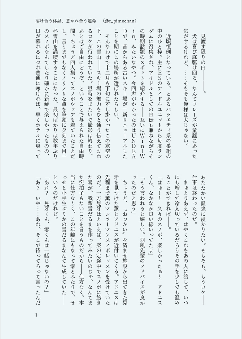 みおち☆quiet followPAST2022.12.24零晃『溶け合う体温、惹かれ合う運命』雪山遭難話。ちょっとだけエッチですけど全年齢 show all(+15 images) Tap to full screen (size:1170x1637).Repost is prohibited Let's send reactions! freqpopularsnackothersPayment processing Replies from the creator Follow creator you care about!☆quiet follow みおちDONE2023.7.18 『GRITTER』零晃 晃牙くん 誕生日のお話 11 みおちPAST2023.2.25零晃ワンライ お題「大好き」『一年越しの、「」』 9 みおちPAST2022.12.24零晃『溶け合う体温、惹かれ合う運命』雪山遭難話。ちょっとだけエッチですけど全年齢 16 みおちPAST2022.11.2零晃『おあいこ』零ちゃんハッピーバースデーのお話でした 私の大好きな零晃関係です 14 みおちPAST2022.8.16『夏の心霊零晃』 11 みおちPAST2022.6.18『蛍見に行く零晃』 10 recommended works spi_ppyPAST今まで描いてきたもの。だいたいアニテでビーちゃんばっかり。 25 台無しテレサ🔞休止中DONEナヒーダ&蛍 はくゆTRAINING進捗ぽいぽい 悩み中😶🌫→整地しました(3パターン目) 6 masudanosousakuDONE狼谷 昴 7 書類(ekka)SPOILER⚠️軍師豪華版パンフのネタバレを含みます小説の立花先輩がとてもよかったと言う漫画です ほけじいDONE ina56mkrDONEシルエルの絵のまとめです 3 ラテ茶PROGRESS nachi_osoraDONE新年一発目の短くないけどさほど長くもないK暁!前にお題で書き始めたけど長くなりそうで放ってたのを仕上げました。けけに秘密で女狐チャンを試すあきとくん、まぁばれるよねってお話です。すでに付き合ってる二人。頭からっぽで読んでほしい。 2679