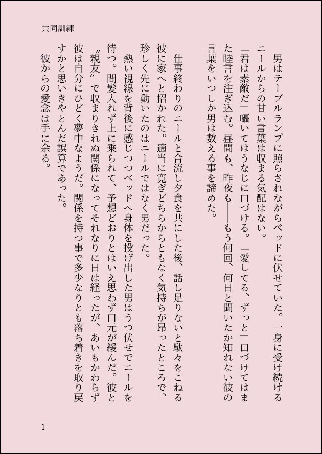 もそし☆quiet followDONE共同訓練未来プロタゴニストと若ニール。ニールがベタベタ。 show all(+3 images) Tap to full screen (size:630x888).Repost is prohibited Let's send reactions! freqpopularsnackothersPayment processing Replies from the creator Follow creator you care about!☆quiet follow もそしMAIKING【12/17 途中です】ニールとプロタゴニスト、お互いがお互いを「好きなの?」「好きなのか?」と様子見してる間にアイブスが巻き込まれてる。【完成がんばる】 2 もそしDONE色々目覚めちゃったニールとその悩みの話。謎時系列の恋人の二人。 3666 もそしDONE(あえての)no title※「プロタがエロい下着を履く」という裏アカに載せた短文※ニール視点(P1〜2)、プロタ視点(P3〜5)※本番描写無いですがそういう描写があります 5 もそしDONE二人のお相手【後編】プロタゴニストが若いニールに興味持っちゃったから手を出しちゃった話。18↑? 16 もそしDONEブラインド・ストーリー【後編】※ニールの思考が「彼>>>>略>>>>世界」※軽めの拷問シーンあり 13 もそしDONEブラインド・ストーリー【前編】プロタゴニストのいない世界でニールが闇堕ちする話。まだ闇堕ちてないしまだ主が出てません。 7 recommended works nanoDONE【テネ/ニル主】※ネタバレあり??プロタと出会う前のニール君はなんかの研究員とかだったらいいなぁっていう妄想。あと、過去プロタと自分が思ってた以上に関係が近くなりすぎて、過去に不思議に思ってたプロタの事がわかっちゃうニールくん 2 ochimpobeamDONEサイズ間違えたので再掲#Neiltagonist#TENET#ニル主#Halloween yokusaruruDOODLEニル主 yokusaruruDOODLEニル主 ponta_cinemaDOODLE生きて帰る ponta_cinemaDOODLEニル主。 greenteaDONE学生AUで青い春。鬱展開ではないのでご安心を。 3 mapppp_pDONE景気づけに💋 amakusa4INFOニル主本『羽化』お買い上げいただいた方への、サポプラ・ブースト御礼用SSSです。申し訳ないことにポストカードで添付し忘れた方がいらっしゃるので、こちらでPW公開とさせていただきます💦本当にすみません💦💦