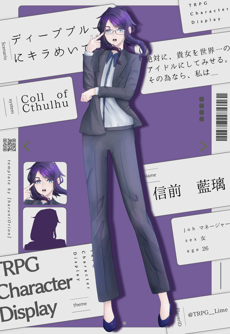 TRPG__Lime☆quiet followDONE【ディープブルーにキラめいて】HOマネージャー 信前 藍璃「彼女はいずれ必ず世界一になります。絶対に、私がそうさせます」通常立ち絵+メガネなし差分 show all(+1 images) Tap to full screen (size:1721x2500).Repost is prohibited Let's send reactions! freqpopularsnackothersPayment processing Replies from the creator Follow creator you care about!☆quiet follow TRPG__LimeDONE【月面世界】月花 京彗「月にはみんながいるんです。だから俺は、俺は……」発狂差分 2 TRPG__LimeDONE【裏切り者のワルツ】HO???HOネタバレ差分あるので現行未通過❌差分2種 3 TRPG__LimeDONE【花冷えに亡く季節】HO記 栢野星青「私の毎日は希望に満ち溢れているんだよ!」差分2種(笑顔、正気度喪失) 3 TRPG__LimeDONE【灰になってよかった】夜日暮 晨明「いっそ灰被りのヒロインにでもなれればよかった」 TRPG__LimeDONE【砂上のβとXへの回帰】蜂中 展歩/ハニィビー「アッ、フクロイラネッス……アッアッ、ふく、袋ッアッツケッアッ……アザス…」 2 TRPG__LimeDONE【胡桃炸裂症候群-Drosselmeyer Syndrome-】HO公安 朱 苺華「つまりは力こそパワーってわけ。義足やろうが腕があるっちゃけんこっちば鍛えたらよかっちゃん」 2