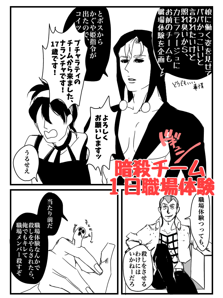 21_s_m☆quiet followDONE「暗殺チーム 1日職場体験」リクエストいただいたもの。ナランチャが暗殺チームに1日職場体験に行きます。 show all(+6 images) Tap to full screen (size:768x1024).Repost is prohibited Let's send reactions! freqpopularsnackothersPayment processing Replies from the creator Follow creator you care about!☆quiet follow 21_s_mDONE「金色の墓守り」リクエストいただいた、メローネの暗チ加入漫画 16 21_s_mDONE「ギャグまとめ2」リーダーぼいんぼいん他 15 21_s_mDONE「おとうさんスイッチ おじいちゃんも可」リクエストいただいたもの。兄貴による本気のジジ芸。 3 21_s_mDONE「ギャグまとめ」ペッシと兄貴 29 21_s_mDONE「裸の銃を持つメガネ」リクエストいただいたもの。タイトルは映画「裸の銃を持つ男」を文字ったもの… 4 21_s_mDONE「暗殺チーム 1日職場体験」リクエストいただいたもの。ナランチャが暗殺チームに1日職場体験に行きます。 7 recommended works chabasiranDONEリーダー知った時の印象←Before After→ 2 any_tamariDOODLEうるさ… any_tamariDOODLE楽しみだぞ!棺桶にぶち込まれる楽しみだ! choco_ampanDOODLEキリンとシマウマ衣装でメローネとギアッチョ jo_jk_ts_gjPAST주나카르 LOG 8 おれんじPAST聖剣伝説レジェンドオブマナ、エスカデ編本の再録です。 27 uruouneDONE 5 POI10318240DOODLE清峰哥生贺(2) 5 papjptptpwpwDOODLEグレパニ③