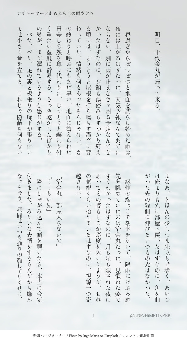 まくらなげ☆quiet followDONEあめふらしの雨やどり/北谷菜切と治金丸千代金丸の修行帰還前夜、雨が止むのを待ちながら show all(+5 images) Tap to full screen (size:618x1132).Repost is prohibited Let's send reactions! freqpopularsnackothersPayment processing Replies from the creator Follow creator you care about!☆quiet follow まくらなげDONE2025もコラボありがとうございました!の稲富in岩国まとめ 13 まくらなげDONE先天♀双璧のにょた百合らくがき左右非固定稲富稲です 話繋がってない後半いかがわしいのがちょっと 6 まくらなげDONE稲葉大・小と桜の話W稲葉がこそこそ内緒話したり桜を食べたり!できてるいなとみ 二振り目が赤子の姿で顕現する本丸で育児するふたりhttps://poipiku.com/2302811/10924235.htmlの続き 4 まくらなげDONE富田大・小と歯形の話/稲富延々いちゃついたり噛み付いたりだけ!できてるいなとみ 二振り目が赤子の姿で顕現する本丸で育児するふたり 5 まくらなげDONEもたさんへ!できてる稲富とべびいなとみ(二振り目) 2 まくらなげDONEお題「傷」あめくもワンライ参加作品/※性別不詳 喋る主がいます/雲とお守りの話 4 recommended works syokizyanaizyanDONEモブマレ 10 loremiyuDOODLE映画見たその日にこんなもんロマンティクスしとるやろがい!!!!で妄想したんだけど、小説やら監督発言やらでいややっぱロマンティクスしてなくない?????ってなって没にしたんだけどこういうやりとりしてほしかったので書きました p0c0jDONE最赤の過程 5 かんぱりDOODLEこれがセッション中生えたかんたんみみちゃん Makibao_2TRAINING某写真集を参考にしながら描いた女体練習絵 ⚠️全裸注意 森野クマ3PROGRESS今日の進歩468これからしばらくこんな感じの普通な状況が続きます よもぎDOODLEみんな切身をすこれ Onigiriland.comDOODLE🏇 _k0t0ne___DOODLE