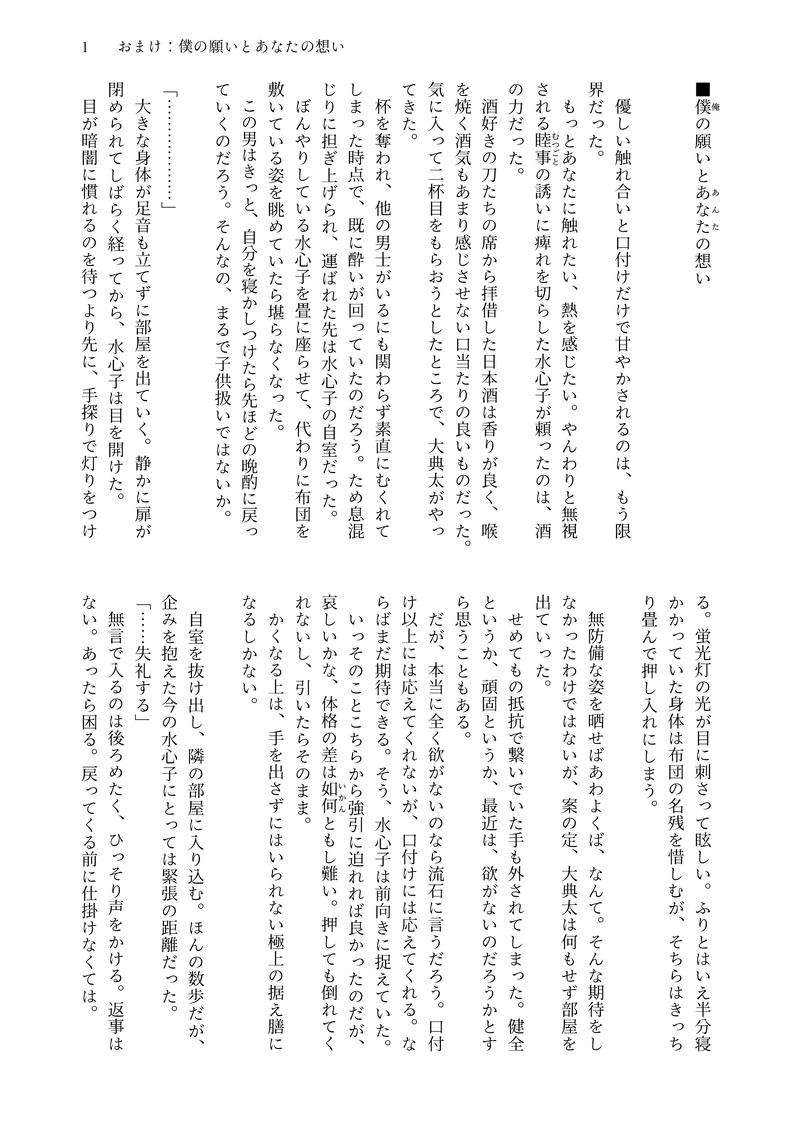 citronius☆quiet followDONE1027の無料でした。同日発行の新刊「想いの咲花・上」に収録したお話「想いだけでは実らないから」を、もしこんな展開なら……という形で書いてみました。現代遠征でYES/NO枕を買ってきたのは誰でしょうね #典水 pawnWater show all(+5 images) Tap to full screen (size:1750x2479).Repost is prohibited Let's send reactions! freqpopularsnackothersPayment processing Replies from the creator Follow creator you care about!☆quiet follow citroniusPAST◇想いの測り方1月のイベント後通販のBOOSTお礼でした。ありがとうございました!アレの大きさはいかほどか、っていうほんとにしょうもないお話です。水心子くんのことは好奇心で痛い目に遭うネコチャンだと思ってる節があります。 5 citroniusPAST◇みちしるべ修行に出た大典太を想う水心子くんと、前田くんのお話。2024年の7月に出したものを、修行一周年に合わせて再掲。信じて待てども心は揺れる。その帰りを心待ちにして。 6 citroniusDONE◇Melty melty Morning2月のひらブーに載せたもの。冬の朝の二度寝の典水ちゃん 3 citroniusPAST◇心が想う先は兄弟に報告する大典太さん。「ひかり」の続き0126発行「想いの咲花・下」に収録した「想いと、拳と」の導入でもあります。 2 citroniusDONE◇ひとたらし1/26(日)閃華の無配予定、でした。ひとたらしのみつよさん祝装良すぎたねという話 4 citroniusPAST◇いつかの極薄0.01ミリ10月のスパーク後のBoostお礼の小話でした。ありがとうございました!お礼がこんなのでいいのかっていう、こっ恥ずかしいしょうもないギャグですいません。書いてる途中で大典太さんがちょっと可哀想に思えたんですが、そこもまた愛嬌ということで。 5 related works きゅうりDOODLE典水ドライハンプチャレンジ💪😌🩶💜すりすり……ゴリゴリ……♡ 2 きゅうりDONE水心子うさぎバグ🐰典水🔞典「あんまりかわいかったからつい…」ちゃんと…描いた……お手柔らかに……🗝……典水刀帳番号続けて5桁 4 chizuuu03DOODLE821の日なので🦊🐰典水でいちゃこら※👯はいません※フェ⚪︎ありのため🔞※ケモ耳です鍵 成人済み→ y n_agio666REHABILI光世と水心子が元々できちゃってる本丸という感じで見てもらうしかない(?)非常に頭悪そうなIQ3レベルの典水漫画を描いてしまった。もうね、孫六さんありがとうございます。好きなタイプでした。波乱!!!!!! 10 百音モネDOODLE※典水 ※R18色々不勉強ですが勢いで描きましたワァ~~……!190cmの天下五剣は……受け入れるのとんでもなく大変だろうなって……思いながら…… citroniusDONE◇Melty melty Morning2月のひらブーに載せたもの。冬の朝の二度寝の典水ちゃん 3 ちゃきなこDOODLE典水典水典水〜〜描いた🔞❓→yes/no きゅうりMOURNING昨晩🔞描いてみたけど恥ずかしくなっちゃってこれ以上描けそうにないのでここに供養🗝……典水刀帳番号続けて5桁 2 yokubuka_snwDOODLE癖詰め込み※典水⚠️18↑?
