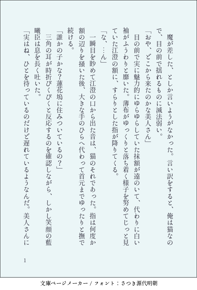 たなか☆quiet followDONE猫になっちゃう江澄と猫を撫でちゃう藍曦臣の話魔が差したやつ⑥ #曦澄 #魔が差したやつ show all(+13 images) Tap to full screen (size:630x928).Repost is prohibited Let's send reactions! freqpopularsnackothersPayment processing Replies from the creator Follow creator you care about!☆quiet follow たなかDONE舊夢之花李蓮花と方多病が面倒に首を突っ込まされる話です。死人が出ますがアクションは皆無です。心の蓮花楼ぢからが試されます。方多病の出自を李蓮花だけが知っている頃の話です。兄相の人が書いたので、そうかもしれません。どんな内容でも大丈夫な方は、方多病の年齢を漢数字で入力ください。 85 たなかDONE蝋梅李相夷17歳、単孤刀25歳頃の話です。直接的表現はありませんが、兄相前提の笛相ですのでご注意ください。よろしければ、笛飛声が盟主である門派に含まれる色を英語(全て小文字)でご入力ください。 4 たなかDONE獣は道を断てり李相夷16歳、単孤刀24歳の頃のお話です。明確なCP表現はありませんが、兄相ですのでご注意ください。作中で死人が出ます。アクションは皆無です。なので蓮花楼ぢからを駆使してお読みいただけますと幸いです。大丈夫な方は、ドラマ内で単孤刀が掌握した組織と李相夷が立ち上げた組織の数字部分を掛け算した答えを半角アラビア数字でご入力ください。 77 たなかDONE壟断の人蓮花楼にどハマりしました。四顧門時代の単孤刀と李相夷です。致すことを致しておりますが直接的な表現はありません。師兄から李相夷への強くて深くて濃厚で複雑な感情もさることながら、李相夷から師兄への思いもかなり厄介なものだと思います。なんでも許せる方は師兄がかわいい弟へ贈った軟剣の名前を入力してください。 4 たなかDONE悃誠蓮花楼にどハマりしました。三人がわちゃわちゃしているのが大好きですが、力量が足りませんでした。想像力と蓮花楼ぢからが試されます。笛飛声の記憶がない頃です。人は死んでます。何でも許せる方は、李相夷の軟剣の素材の名前を入力してお進みください。 70 たなかDONE烏托邦蓮花楼にどハマりしました。三人の男たちがわちゃわちゃしているのが大好きなのですが、力量が足りず李蓮花と方多病しか出てきません。笛飛声はいません。心の笛力と想像力が試されます。しかもあんまりわちゃわちゃしていません人は死んでます。大丈夫な方は方多病の家僕(男)の名前を漢字で入力してください。 38 related works たなかDONE猫になっちゃう江澄と猫を撫でちゃう藍曦臣の話魔が差したやつ⑥ 14 たなかDONE江澄が藍曦臣と同衾しちゃう話魔が差したやつ⑦ 11 たなかDONE江澄が藍曦臣に酒飲ませちゃう話魔が差したやつ④ 12 たなかDONE江澄を困らせちゃう藍曦臣と藍曦臣を困らせちゃう江澄の話魔が差したやつ⑤ 8 たなかDONE江澄が藍曦臣にやばいきのこたべさせちゃう話魔が差したやつ① 6 たなかDONE江澄が藍曦臣の裂冰を咥えようとしちゃう話魔が差したやつ② 7 たなかDONEボタンがあると押しちゃう江澄と、藍曦臣の話魔が差したやつ③ 10 recommended works takami180PROGRESS恋綴4-2ひたすら甘ったるい 2328 A_YING__MAIKING中途半端なところで終わってます。。。ただ江澄から藍曦臣に「俺を抱け」って言ってほしくて書いただけのものです。媚薬でも術でもなく素面で抱いてくれって言ってほしかったの。でもそこまでたどり着いてないよorzなのでまだR18ではありません。藍曦臣大怪我します。怪物の頭が爆発してます。苦手な方は逃げてください! 20 夢魅屋の終雪DONE現代AU藍家に同居している両片思いの大学生の曦澄クリスマスアンケートSS 3426 yunoDONE #曦澄ワンドロワンライ の『犬』にて。江澄が新たな犬を飼うほのぼの話です。曦澄は遠距離婚の熟練夫夫みたいな感じ。兄上が策士っぽい。 2572 西村ルルDONE曦澄ワンドロワンライ お題:不意打ち。現代AU。ランチデートの帰りにソフトクリームを食べる二人。不意打ちの◯◯に曦臣ドキッ! 2 玲音くんDOODLE【注】r15?、BL初投稿からまさかのこれですキャラ名は左側アルト、右ドクターという名前ですパスワード→artdct ---MOURNING他ジャンルですが手が回らないのでここにそっと供養。細胞。死ネタです。 9 RakuaisouDOODLE捏造まみれ〜な絵をみたいですかみたいorみたくない _codetan_INFO【人の心は妖面の如し】12/25KP:冬真Ho壱:こまの(凩 零)Ho弐:巳田巴(天狗山 小鳶)Ho参:コデッタ(夜叉)Ho肆:奏河(黄榮 与)#コデ卓報告行ってきました!PCのやりたいようにやらせていたら、PLはヒヤヒヤでしたそして自陣に絆され救われました…夢が叶って良かったねお世話になりました!感謝感謝!そしてこれからもお世話になります!※2枚目以降ネタバレ注意 9