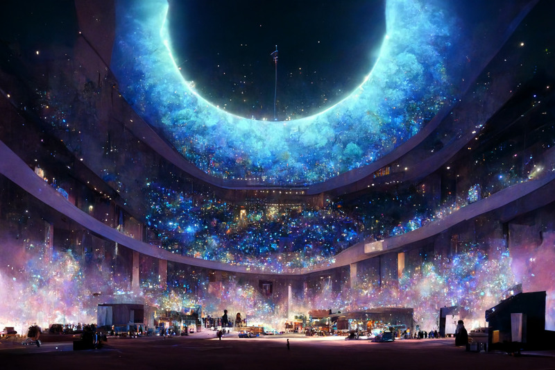 bluish purple, black hole, starry sky, concert hall with stone cirle on the stage, monoliths by makoto shinkai, Highly Detailed, --ar 3:2