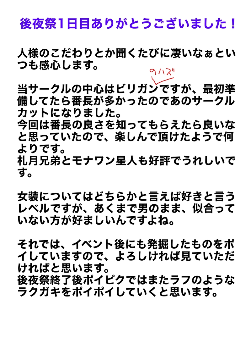 がん子☆quiet followINFO後夜祭1夜目お疲れ様でした。女装のくだりは恥ずかしかったけど楽しかったです! #ビー標的 b-target #ビー標的後夜祭_参加中 #スーパービーダマン superBiderman Tap to full screen (size:1075x1518).Repost is prohibited Let's send reactions! freqpopularsnackothersPayment processing Replies from the creator Follow creator you care about!☆quiet follow がん子CAN’T MAKE久しぶりに忍たま模写しようと思ったんだけど がん子CAN’T MAKEキングビーダーズのハロウィン絵を描きたかった 2 がん子DOODLE1年生長次 がん子MEMO羊毛チクチクしたいけど手が痛い。 がん子DONE円誕生日おめでとう!いただき物のお礼として以前出してたキス魔のビリーネタのネームを完成させました。リクエストしていただいたおかげで完成できました。 がん子DOODLE烈兄貴の誕生祝い描けなかった。 related works がん子INFOなかなか想いを言葉にできなくて、その間主人公ズを描いてました。多分タマゴ以外初描き。 kazushi01PASTスパビ系 高原兄弟多め 過去絵 32 がん子INFOWebオンリー展示作品について がん子DONEビリガン以前スパビーが発売された時に描いてポイしてたネームを清書しました。Webイベントに間に合わせたかったのですが、この程度仕上げるのに何日もかかります。ゼェゼェ。 がん子INFO後夜祭1夜目お疲れ様でした。女装のくだりは恥ずかしかったけど楽しかったです! kazushi01PASTバトビ系 過去絵 6/6bd寄り 4