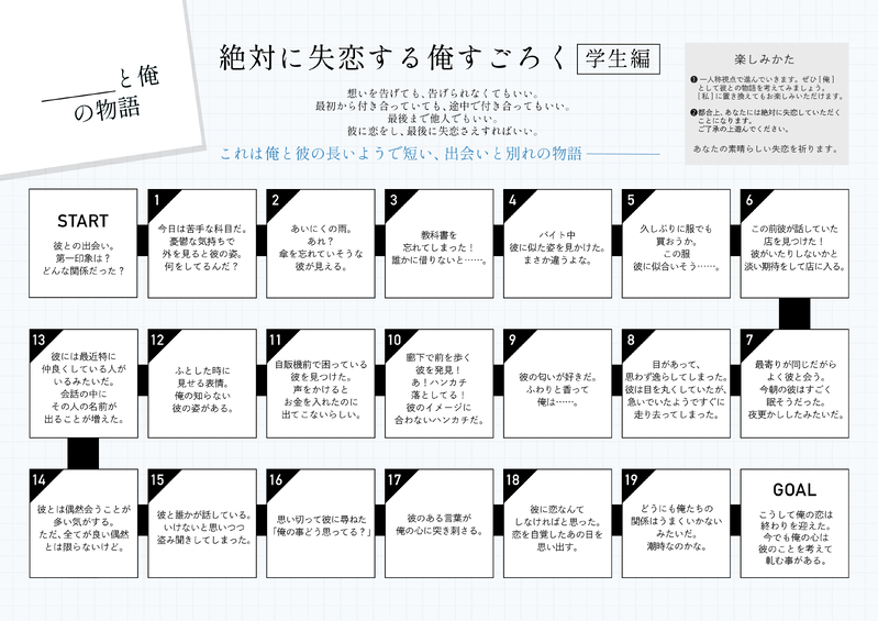cnclmbn☆quiet followDONE絶対に失恋する俺すごろく 学生編推しに失恋したい方へいろいろな失恋パターンが楽しめるように作っています。ご自由にお使いください。[私]にしてもお楽しみいただけます。 Tap to full screen (size:3508x2481).Repost is prohibited Let's send reactions! freqpopularsnackothersPayment processing Replies from the creator Follow creator you care about!☆quiet follow cnclmbnDONEブラネロwebオンリー10「Bright Next Stage」のネットプリントです。 2 cnclmbnDONEブラネロwebオンリー10「Bright Next Stage」の展示漫画です。何にもない日のあったかもしれない日常 4 cnclmbnINFO6/25に発行したブラネロ本 (ネタバレを含みます)『ふたりはまだ。』のあとがきの途中がまるまる吹っ飛んでいました。ここに訂正してお詫びします。 cnclmbnDONEモブネロwebオンリー「気になる彼は料理人」展示漫画でした短い漫画集ブラネロ含みますがブラッドリーは出てこないし気配がするだけです過去作も入っています。 13 cnclmbnDONEモブネロwebオンリー「気になる彼は料理人」展示漫画でしたモブとネロが西の国で出会う話前提CPなし 21 cnclmbnDONEめでたい絵マイクロビキニ兎耳ブラネロ recommended works オニオンDONE自分で描かないと誰もですのでお願い致します仲間求めます。 7 叁柒贰拾壹DOODLE宿虎 4 おちゃもちDONEダニ主♀。両片思い。ネームレス。主人公とダニエルは🦅寮生設定。初日の出を一緒に見る話。※BOOSTありがとうございました!心ばかりですが、返礼品です。暇潰しにどうぞ。 2233 ののめDONE⚠️肌色多めプレゼントになってくれるbnmrさんです。メリークリスマス🎄🎅🎁 かみまMEMO「なんだかんだアナログな紙のほうが、パッ!と直感的にメモったりアイディア出しができるよね〜」という話を、今日の昼間に雑談アカでしておりまして。こういう下書き未満の構図案みたいなものも、クロッキー帳と鉛筆のほうがザクザクやりやすいもんなあ… 2 POI10729119DOODLE柴チヒ 全身にキスしたいという可愛い6️⃣平の犬 3 Dagn1818DOODLE⚠️読むの自己責任でお願いします 590 Lyz_ngroDOODLEngro ⚠️人外🔞rkgk 218↑?(yes or no) 6 ちゃーみーDONEアルテア🎩 2