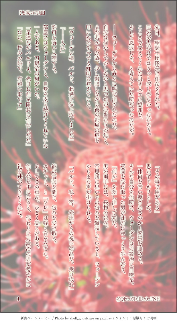 水面🦔(焼き蜜柑)☆quiet followDONE・バルドさんとその刀達のお話 (捏造しかない、前半モブ多め)書き始めが果たしてこれで良いのか...🤔でもネタが降ってきちゃったから仕方ないよね!!過去が明かされてない時に書いている物なので、どうかあしからず🙇♀️ ##バルナザ/バルウォ show all(+3 images) Tap to full screen (size:618x1132).Repost is prohibited Let's send reactions! freqpopularsnackothersPayment processing Replies from the creator Follow creator you care about!☆quiet follow 水面🦔(焼き蜜柑)DONE【みにバミ冒険日記③~就寝編~】縮んだバミが今度はせんせ~を使ってある事を再現しようとする話🛌ある事とはアレです、某映画のあのシーンです伝われ………バミはこの後もぞもぞもがいてたらそれで起きたせんせ~の手によって(言葉通り)無事救出されました🙏 5 水面🦔(焼き蜜柑)DONE☀️ばるうぉ ある夏の日 5/42人でかき氷を食べる話🍧筆がのっちゃって長くなってしまったブツです🙏今回は主従というより義兄弟の関係を重点にかきかきしました 5 水面🦔(焼き蜜柑)DONE☀️ばみせい 夏のある日バルミスさんが暑さでやられてるのをせんせ~が看病するようなお話 バミ暑いの苦手なのでは説はアレです、ふぉろわ様が仰っていたりこれopの夏の場面で誰よりも脱いでいたところからです(逆にせんせ~は一人日向にいて全く脱いでなかったから強い説) 4 水面🦔(焼き蜜柑)DONE㊗️ザレイズリコレクション1周年~~~!!!🎉🎉🎊🎊✨✨誠におめでとうございます...!!ザレイズオリジナルキャラクター達もですがリコレキャラももうほんと大好きで...これからも彼ら含めた物語楽しみにしております~!!☺️💞 水面🦔(焼き蜜柑)DONE【ウォ様とバル+バミ えいぷりるふ~る2024ver,】(おまけ絵もあるよ(見ると想像しやすいかも))バルドとバルミスさんがて~るずお馴染みの"あの魔物"へと変身してしまいウォ様が面倒見るお話バルバミ達がひたすらぽよんぽよんしながらぽよぽよゆらゆらギスギスしているのでウォ様が頭を抱えている 申し訳ねぇ......しかし書いてるにんげんはめちゃくちゃ楽しかった() 12 水面🦔(焼き蜜柑)DONE📜ばみせい前提、こだまくん+バミによる秘密(?)会議だった話2人が我が道を行くせいでせんせ~にひたすら頑張っていただきました()バミ、それはもう色々体験してきたからバルド(過去)よりも欲求を率直に表へと出すんじゃないかなぁ~と(後悔しないように)それはそれとしてこだまくんは大事な相棒をそう簡単には差し出さないと良いなと 大切にしなきゃ許さないし返して貰う気満々だと私が嬉しい🙏🙏🙏 6 recommended works なつせMAIKINGTOtRジュニア人見知りしたら可愛いよねって言うちびご主人様のほうの絵 なつせMAIKINGTOtRフィルマク マークくんの触覚描き忘れてるわ なつせPROGRESSTOtRフィルマク2月に出す布教本の予定原作の立ち絵っぽくね なつせPROGRESSやっとそれっぽく描けるようになった気がする 水面🦔(焼き蜜柑)DONE・登場人物→ほぼ日研、カンタレラ組+α(最後のみ)少し前にTwitterに呟いたネタを書き留めてみました本当はもっと短くなる予定が、長々となってしまって書くのが大変だった...もし誤字やキャラの呼び方違うよとかあったら申し訳ない😓 12 りんぶるDONEまだザレイズに参戦したばかりのころのヴェイグちゃんとセネセネ。オール捏造、1部終章〜2部1章ごろのつもり 5 りんぶるDONEザレイズアニーちゃんの日記。参戦イベ(BRIDAL STORIES)前後の時間軸 13 りんぶるDONEザレイズのレイスと母上とヒルダさんのお話熱狂の夏祭り以降、レイス視点。ロナさんが捏造アンド捏造 27 kasihatanDOODLEヴァン師匠とアレクセイがザレイズのイベントやらなんやらで結構一緒だったのでちょい嫉妬のレイヴン。TOVでレイヴンはヴァン師匠の衣装着れたからね。