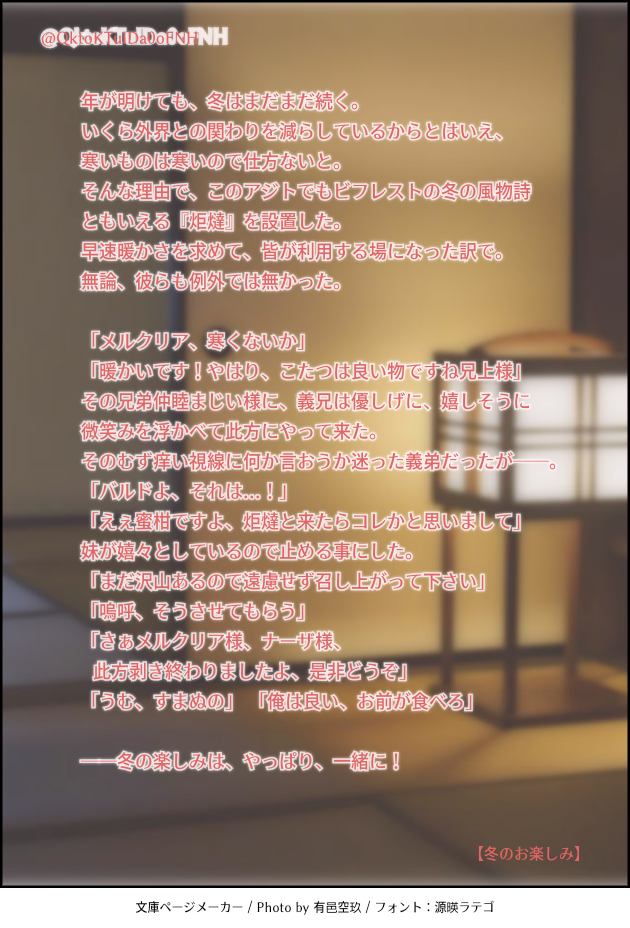 水面🦔(焼き蜜柑)☆quiet followDONE炬燵とみかんのお話🍊少し前までルームに置いてあったので書き留めました!!穏やかであれビフレスト......登場人物→ナーザ様、メルクリア様、バルドさん ##ザレイズ Tap to full screen (size:630x928).Repost is prohibited Let's send reactions! freqpopularsnackothersPayment processing Replies from the creator Follow creator you care about!☆quiet follow 水面🦔(焼き蜜柑)DONE【みにバミ冒険日記③~就寝編~】縮んだバミが今度はせんせ~を使ってある事を再現しようとする話🛌ある事とはアレです、某映画のあのシーンです伝われ………バミはこの後もぞもぞもがいてたらそれで起きたせんせ~の手によって(言葉通り)無事救出されました🙏 5 水面🦔(焼き蜜柑)DONE☀️ばるうぉ ある夏の日 5/42人でかき氷を食べる話🍧筆がのっちゃって長くなってしまったブツです🙏今回は主従というより義兄弟の関係を重点にかきかきしました 5 水面🦔(焼き蜜柑)DONE☀️ばみせい 夏のある日バルミスさんが暑さでやられてるのをせんせ~が看病するようなお話 バミ暑いの苦手なのでは説はアレです、ふぉろわ様が仰っていたりこれopの夏の場面で誰よりも脱いでいたところからです(逆にせんせ~は一人日向にいて全く脱いでなかったから強い説) 4 水面🦔(焼き蜜柑)DONE㊗️ザレイズリコレクション1周年~~~!!!🎉🎉🎊🎊✨✨誠におめでとうございます...!!ザレイズオリジナルキャラクター達もですがリコレキャラももうほんと大好きで...これからも彼ら含めた物語楽しみにしております~!!☺️💞 水面🦔(焼き蜜柑)DONE【ウォ様とバル+バミ えいぷりるふ~る2024ver,】(おまけ絵もあるよ(見ると想像しやすいかも))バルドとバルミスさんがて~るずお馴染みの"あの魔物"へと変身してしまいウォ様が面倒見るお話バルバミ達がひたすらぽよんぽよんしながらぽよぽよゆらゆらギスギスしているのでウォ様が頭を抱えている 申し訳ねぇ......しかし書いてるにんげんはめちゃくちゃ楽しかった() 12 水面🦔(焼き蜜柑)DONE📜ばみせい前提、こだまくん+バミによる秘密(?)会議だった話2人が我が道を行くせいでせんせ~にひたすら頑張っていただきました()バミ、それはもう色々体験してきたからバルド(過去)よりも欲求を率直に表へと出すんじゃないかなぁ~と(後悔しないように)それはそれとしてこだまくんは大事な相棒をそう簡単には差し出さないと良いなと 大切にしなきゃ許さないし返して貰う気満々だと私が嬉しい🙏🙏🙏 6 recommended works なつせMAIKINGTOtRジュニア人見知りしたら可愛いよねって言うちびご主人様のほうの絵 なつせMAIKINGTOtRフィルマク マークくんの触覚描き忘れてるわ なつせPROGRESSやっとそれっぽく描けるようになった気がする thxPASTTOS以外のテイルズ絵まとめ 3 ヒノ(ロクミハシコ)DOODLEバレンタインアシュナタ 水面🦔(焼き蜜柑)DONE・登場人物→ほぼ日研、カンタレラ組+α(最後のみ)少し前にTwitterに呟いたネタを書き留めてみました本当はもっと短くなる予定が、長々となってしまって書くのが大変だった...もし誤字やキャラの呼び方違うよとかあったら申し訳ない😓 12 水面🦔(焼き蜜柑)DONE水月先輩の誕生日記念で書いていた物です本来の予定ならこんなに長くなるはずではなかったもっと色々工夫や改善して上手く書きたいな~😓 18 りんぶるDONEまだザレイズに参戦したばかりのころのヴェイグちゃんとセネセネ。オール捏造、1部終章〜2部1章ごろのつもり 5 りんぶるDONEザレイズアニーちゃんの日記。参戦イベ(BRIDAL STORIES)前後の時間軸 13