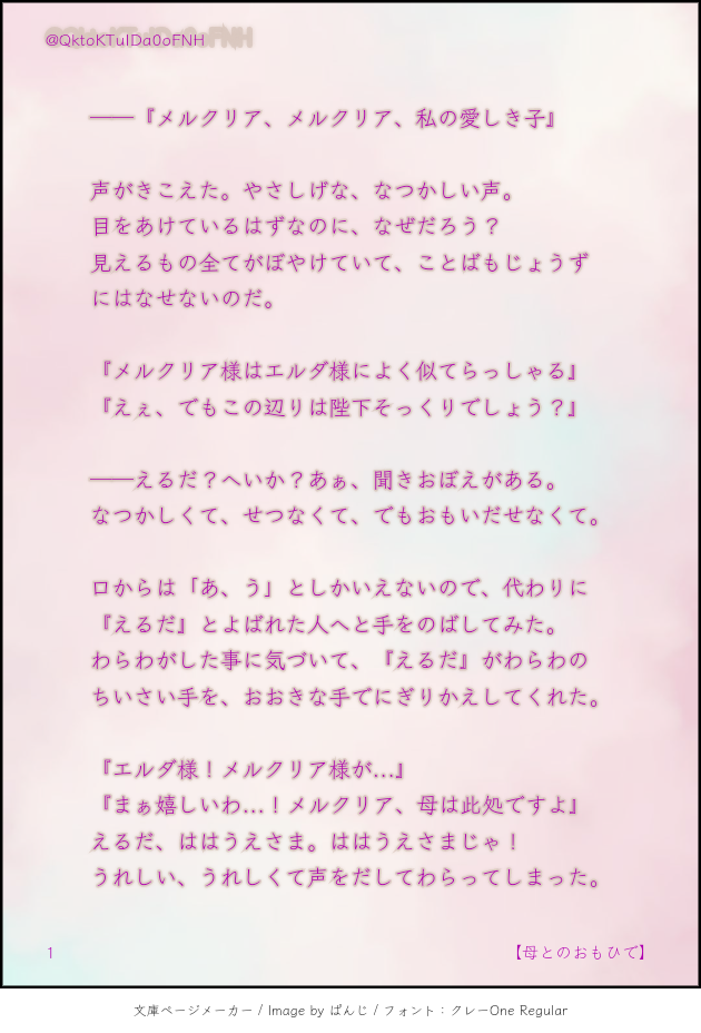 水面🦔(焼き蜜柑)☆quiet followDONE幼き日のメルクリア様と、エルダ皇后様の穏やかな一時の話🌸ははの日と云う事で、またもや急いで煎じたお話になります☺️🙏🙏前半まだビフレスト皇国がご健在時の設定で書いてます(※エルダ皇后様の口調や侍女など捏造あり) ビフレスト、穏やかであってくれ...... ##ザレイズ show all(+2 images) Tap to full screen (size:630x928).Repost is prohibited Let's send reactions! freqpopularsnackothersPayment processing Replies from the creator Follow creator you care about!☆quiet follow 水面🦔(焼き蜜柑)DONE【みにバミ冒険日記③~就寝編~】縮んだバミが今度はせんせ~を使ってある事を再現しようとする話🛌ある事とはアレです、某映画のあのシーンです伝われ………バミはこの後もぞもぞもがいてたらそれで起きたせんせ~の手によって(言葉通り)無事救出されました🙏 5 水面🦔(焼き蜜柑)DONE☀️ばるうぉ ある夏の日 5/42人でかき氷を食べる話🍧筆がのっちゃって長くなってしまったブツです🙏今回は主従というより義兄弟の関係を重点にかきかきしました 5 水面🦔(焼き蜜柑)DONE☀️ばみせい 夏のある日バルミスさんが暑さでやられてるのをせんせ~が看病するようなお話 バミ暑いの苦手なのでは説はアレです、ふぉろわ様が仰っていたりこれopの夏の場面で誰よりも脱いでいたところからです(逆にせんせ~は一人日向にいて全く脱いでなかったから強い説) 4 水面🦔(焼き蜜柑)DONE㊗️ザレイズリコレクション1周年~~~!!!🎉🎉🎊🎊✨✨誠におめでとうございます...!!ザレイズオリジナルキャラクター達もですがリコレキャラももうほんと大好きで...これからも彼ら含めた物語楽しみにしております~!!☺️💞 水面🦔(焼き蜜柑)DONE【ウォ様とバル+バミ えいぷりるふ~る2024ver,】(おまけ絵もあるよ(見ると想像しやすいかも))バルドとバルミスさんがて~るずお馴染みの"あの魔物"へと変身してしまいウォ様が面倒見るお話バルバミ達がひたすらぽよんぽよんしながらぽよぽよゆらゆらギスギスしているのでウォ様が頭を抱えている 申し訳ねぇ......しかし書いてるにんげんはめちゃくちゃ楽しかった() 12 水面🦔(焼き蜜柑)DONE📜ばみせい前提、こだまくん+バミによる秘密(?)会議だった話2人が我が道を行くせいでせんせ~にひたすら頑張っていただきました()バミ、それはもう色々体験してきたからバルド(過去)よりも欲求を率直に表へと出すんじゃないかなぁ~と(後悔しないように)それはそれとしてこだまくんは大事な相棒をそう簡単には差し出さないと良いなと 大切にしなきゃ許さないし返して貰う気満々だと私が嬉しい🙏🙏🙏 6 recommended works なつせMAIKINGTOtRジュニア人見知りしたら可愛いよねって言うちびご主人様のほうの絵 なつせPROGRESSTOtRフィルマク2月に出す布教本の予定原作の立ち絵っぽくね なつせPROGRESSやっとそれっぽく描けるようになった気がする りんぶるDONEまだザレイズに参戦したばかりのころのヴェイグちゃんとセネセネ。オール捏造、1部終章〜2部1章ごろのつもり 5 りんぶるDONEザレイズアニーちゃんの日記。参戦イベ(BRIDAL STORIES)前後の時間軸 13 りんぶるDONEミトスが深夜の森でティトレイを見つける話。4部イメージ 18 kasihatanDOODLEヴァンとアレクセイのクロスオーバー魔鏡引くと見れるスキット読んだら…なんか…なんか…こんな感じかなって…。お互いにあ互いの大切にしたいもののために牽制し合ってて可愛いような…。 2 kasihatanDOODLEヴァン師匠とアレクセイがザレイズのイベントやらなんやらで結構一緒だったのでちょい嫉妬のレイヴン。TOVでレイヴンはヴァン師匠の衣装着れたからね。 kasihatanDOODLEザレイズでのヴァスペリア夏イベントでこんな事があったらいいなという妄想。実際には姿は見せずにレイヴンの口から(やや重い)話題で出ましたね。