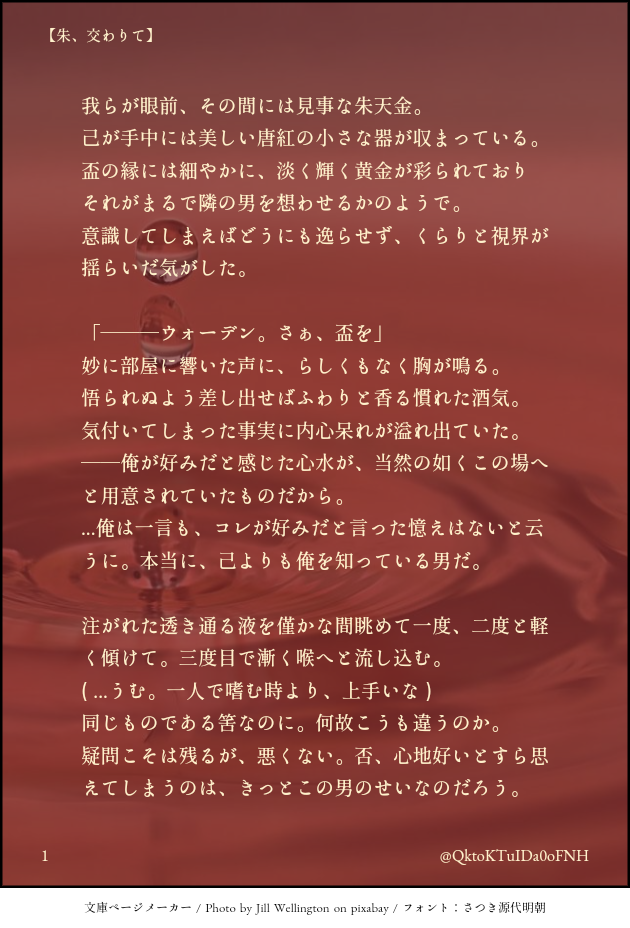 【蛇足】題名の""朱""の部分ですが、実はダブルミーニングで盃等の『朱(しゅ)』と心水の『酒(しゅ)』をかけたりしてます☺️後は盃を合わせて乾杯するシーンも考えました。がそれはまた別の機会になりました🙏