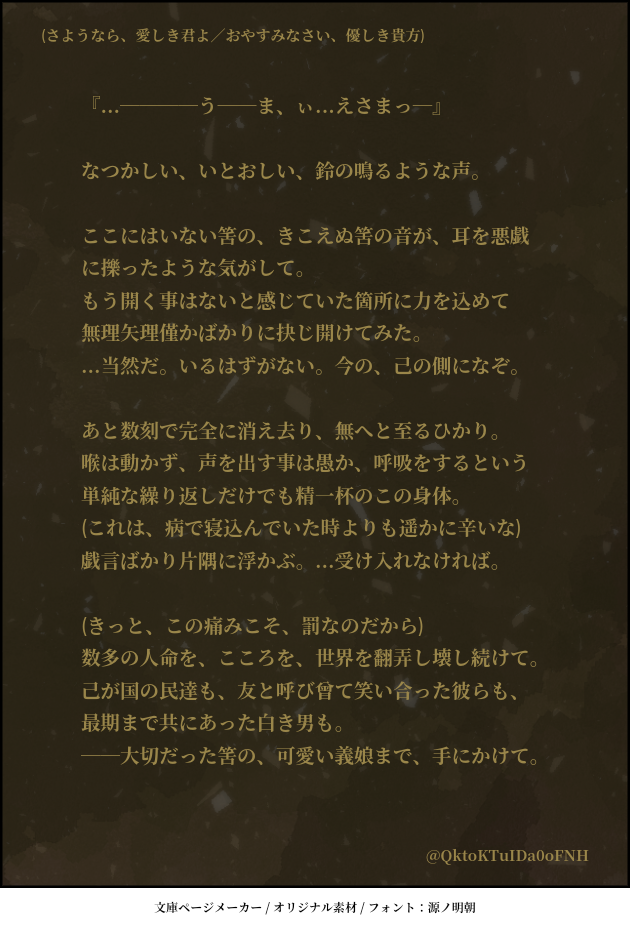 水面🦔(焼き蜜柑)☆quiet followDONE【優しき男の独白】※本編最後辺りネタバレ有何処までも『優しかった』彼の、"娘"へと向けた最期の独白となっております。最期ねぇ...会って話してほしかったなぁ......と思いながら書いてたんですけど自分で自分の首しめる結果になりましたなに???どうしてこうなった???????????? ##ザレイズ show all(+2 images) Tap to full screen (size:630x928).Repost is prohibited Let's send reactions! freqpopularsnackothersPayment processing Replies from the creator Follow creator you care about!☆quiet follow 水面🦔(焼き蜜柑)DONE【みにバミ冒険日記③~就寝編~】縮んだバミが今度はせんせ~を使ってある事を再現しようとする話🛌ある事とはアレです、某映画のあのシーンです伝われ………バミはこの後もぞもぞもがいてたらそれで起きたせんせ~の手によって(言葉通り)無事救出されました🙏 5 水面🦔(焼き蜜柑)DONE☀️ばるうぉ ある夏の日 5/42人でかき氷を食べる話🍧筆がのっちゃって長くなってしまったブツです🙏今回は主従というより義兄弟の関係を重点にかきかきしました 5 水面🦔(焼き蜜柑)DONE☀️ばみせい 夏のある日バルミスさんが暑さでやられてるのをせんせ~が看病するようなお話 バミ暑いの苦手なのでは説はアレです、ふぉろわ様が仰っていたりこれopの夏の場面で誰よりも脱いでいたところからです(逆にせんせ~は一人日向にいて全く脱いでなかったから強い説) 4 水面🦔(焼き蜜柑)DONE㊗️ザレイズリコレクション1周年~~~!!!🎉🎉🎊🎊✨✨誠におめでとうございます...!!ザレイズオリジナルキャラクター達もですがリコレキャラももうほんと大好きで...これからも彼ら含めた物語楽しみにしております~!!☺️💞 水面🦔(焼き蜜柑)DONE【ウォ様とバル+バミ えいぷりるふ~る2024ver,】(おまけ絵もあるよ(見ると想像しやすいかも))バルドとバルミスさんがて~るずお馴染みの"あの魔物"へと変身してしまいウォ様が面倒見るお話バルバミ達がひたすらぽよんぽよんしながらぽよぽよゆらゆらギスギスしているのでウォ様が頭を抱えている 申し訳ねぇ......しかし書いてるにんげんはめちゃくちゃ楽しかった() 12 水面🦔(焼き蜜柑)DONE📜ばみせい前提、こだまくん+バミによる秘密(?)会議だった話2人が我が道を行くせいでせんせ~にひたすら頑張っていただきました()バミ、それはもう色々体験してきたからバルド(過去)よりも欲求を率直に表へと出すんじゃないかなぁ~と(後悔しないように)それはそれとしてこだまくんは大事な相棒をそう簡単には差し出さないと良いなと 大切にしなきゃ許さないし返して貰う気満々だと私が嬉しい🙏🙏🙏 6 recommended works なつせMAIKINGTOtRジュニア人見知りしたら可愛いよねって言うちびご主人様のほうの絵 なつせPROGRESSやっとそれっぽく描けるようになった気がする 水面🦔(焼き蜜柑)DONE・登場人物→ほぼ日研、カンタレラ組+α(最後のみ)少し前にTwitterに呟いたネタを書き留めてみました本当はもっと短くなる予定が、長々となってしまって書くのが大変だった...もし誤字やキャラの呼び方違うよとかあったら申し訳ない😓 12 りんぶるDONEまだザレイズに参戦したばかりのころのヴェイグちゃんとセネセネ。オール捏造、1部終章〜2部1章ごろのつもり 5 りんぶるDONEザレイズアニーちゃんの日記。参戦イベ(BRIDAL STORIES)前後の時間軸 13 りんぶるDONEミトスが深夜の森でティトレイを見つける話。4部イメージ 18 jo_jk_ts_gjPAST주나카르 LOG 8 kasihatanDOODLEザレイズでのヴァスペリア夏イベントでこんな事があったらいいなという妄想。実際には姿は見せずにレイヴンの口から(やや重い)話題で出ましたね。 水面🦔(焼き蜜柑)DONE🎍描き初めビフレスト~!!!今更ながらに完成したので上げます🙏改めて今年もうるせぇとは思いますがどうぞよろしくお願いします☺️【おまけの一幕】この時点では引き分け、後に痺れを切らしたウォ様様に揃って叱られ話し合った結果『2人でお世話をさせていただこう』と纏まった(笑うところ) 2