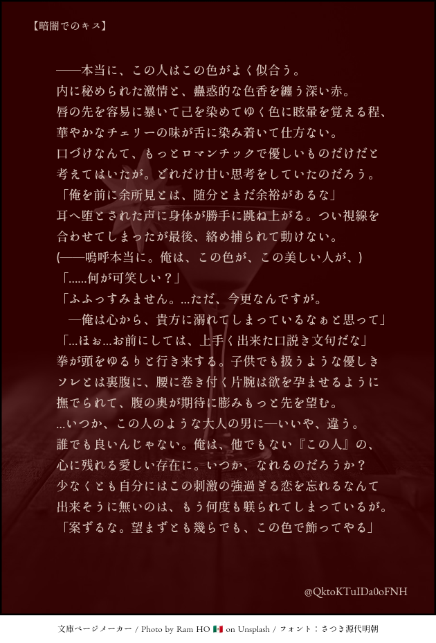 此方のテーマカクテルは『きすいんざだーく』と云う"刺激的な恋"または名の通り"暗闇でのキス"の意味を持つ深い赤色のカクテルとなっています🍸️