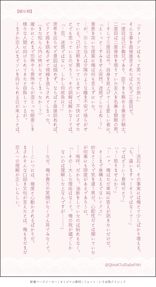 お付き合いをしているうぉいく時空 ウォ様の微笑みの立ち絵が無いので表情筋がちがちに固いなんだろうな~(←不敬) と勝手に思っている