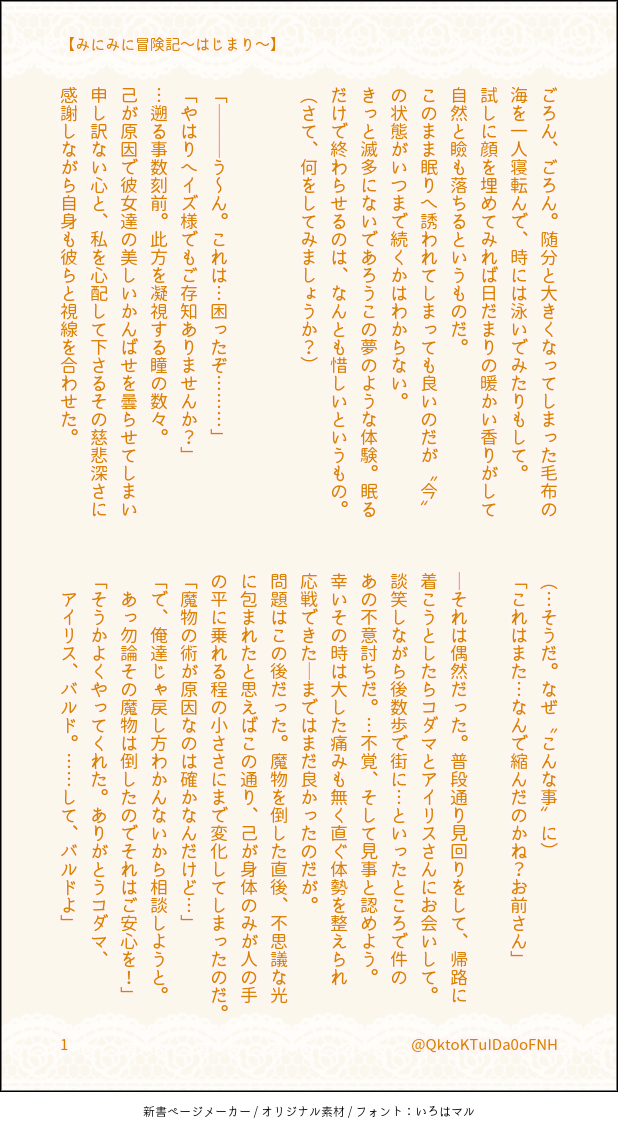 水面🦔(焼き蜜柑)☆quiet followDONE【みにバミさんのぼーけんにっき①】とってもふしぎな術(ご都合あやふや)を受けてしまったバルミスさんが縮む話です~🙏このお話に関してはもうちょっと書きたいなと思っております私が見たいが為に() ##ザレイズ show all(+3 images) Tap to full screen (size:618x1132).Repost is prohibited Let's send reactions! freqpopularsnackothersPayment processing Replies from the creator Follow creator you care about!☆quiet follow 水面🦔(焼き蜜柑)DONE【みにバミ冒険日記③~就寝編~】縮んだバミが今度はせんせ~を使ってある事を再現しようとする話🛌ある事とはアレです、某映画のあのシーンです伝われ………バミはこの後もぞもぞもがいてたらそれで起きたせんせ~の手によって(言葉通り)無事救出されました🙏 5 水面🦔(焼き蜜柑)DONE☀️ばるうぉ ある夏の日 5/42人でかき氷を食べる話🍧筆がのっちゃって長くなってしまったブツです🙏今回は主従というより義兄弟の関係を重点にかきかきしました 5 水面🦔(焼き蜜柑)DONE☀️ばみせい 夏のある日バルミスさんが暑さでやられてるのをせんせ~が看病するようなお話 バミ暑いの苦手なのでは説はアレです、ふぉろわ様が仰っていたりこれopの夏の場面で誰よりも脱いでいたところからです(逆にせんせ~は一人日向にいて全く脱いでなかったから強い説) 4 水面🦔(焼き蜜柑)DONE㊗️ザレイズリコレクション1周年~~~!!!🎉🎉🎊🎊✨✨誠におめでとうございます...!!ザレイズオリジナルキャラクター達もですがリコレキャラももうほんと大好きで...これからも彼ら含めた物語楽しみにしております~!!☺️💞 水面🦔(焼き蜜柑)DONE【ウォ様とバル+バミ えいぷりるふ~る2024ver,】(おまけ絵もあるよ(見ると想像しやすいかも))バルドとバルミスさんがて~るずお馴染みの"あの魔物"へと変身してしまいウォ様が面倒見るお話バルバミ達がひたすらぽよんぽよんしながらぽよぽよゆらゆらギスギスしているのでウォ様が頭を抱えている 申し訳ねぇ......しかし書いてるにんげんはめちゃくちゃ楽しかった() 12 水面🦔(焼き蜜柑)DONE📜ばみせい前提、こだまくん+バミによる秘密(?)会議だった話2人が我が道を行くせいでせんせ~にひたすら頑張っていただきました()バミ、それはもう色々体験してきたからバルド(過去)よりも欲求を率直に表へと出すんじゃないかなぁ~と(後悔しないように)それはそれとしてこだまくんは大事な相棒をそう簡単には差し出さないと良いなと 大切にしなきゃ許さないし返して貰う気満々だと私が嬉しい🙏🙏🙏 6 recommended works なつせMAIKINGTOtRジュニア人見知りしたら可愛いよねって言うちびご主人様のほうの絵 なつせMAIKINGTOtRフィルマク マークくんの触覚描き忘れてるわ なつせPROGRESSTOtRフィルマク2月に出す布教本の予定原作の立ち絵っぽくね aoi_kskTIREDオチが落ちなくて投げた。 thxPASTTOS以外のテイルズ絵まとめ 3 ヒノ(ロクミハシコ)DOODLEバレンタインアシュナタ りんぶるDONEザレイズのレイスと母上とヒルダさんのお話熱狂の夏祭り以降、レイス視点。ロナさんが捏造アンド捏造 27 GgokudaMENUhttps://twitter.com/04220714ti2022年夏発行予定の成人向け炭伊アンソロジー「炭伊事変」R18サンプル4枚※未成年の方の閲覧はご遠慮ください。 4 mattya604PROGRESS進捗