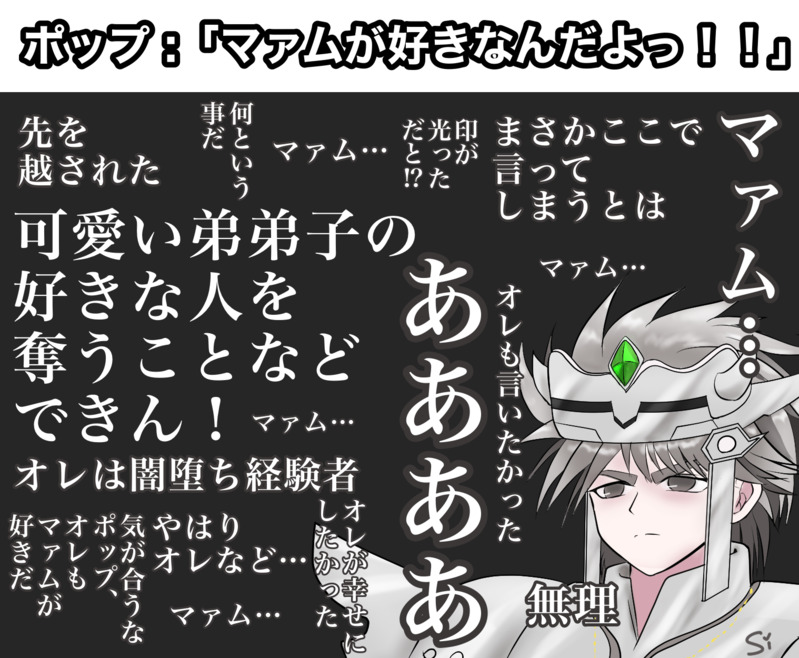 simasimadayone☆quiet followDONEヒュンマフェス・ウィンター作品③【衝撃】ポップの告白を聞いた彼の脳内はこう!一度闇に染まってしまった自分とずっと正義のため頑張ってきた可愛い弟弟子のポップを比べたら、オレなんてマァムにふさわしくないんだ…ってなっちゃったんだよきっと…。で、色んな事で動揺してるマァムのためにも自分の気持ちは抑えてしまったのかな。お互い好きなのにもどかしいんだよなヒュンマは…。 #ヒュンマ hygmma Tap to full screen (size:1518x1250).Repost is prohibited Let's send reactions! freqpopularsnackothersPayment processing Replies from the creator Follow creator you care about!☆quiet follow simasimadayonePROGRESSたまきず時空、ラーとマァムの修行クエストの続き妄想。…の、ラフ。汚くて申し訳ない…。嫉妬するヒュンケルが欲しいので引き続き頑張ります😂 6 simasimadayoneDONE妄想ヒュンマ連携技、魔弾スクライド!!ペーパーをネップリ登録しました。セブンネップリA4片面カラー60円 10/19まで。予約番号:60786726 4 simasimadayoneDONE闘志と天使の生誕祭作品。最近入浴剤を買って、ぼーっとしながら思いついた4コマ2本。もう、はやく付き合っちゃえよな!!! simasimadayoneDOODLE木ドンに嫉妬してからの床ドンはきっと情熱的。…ラーハルトが…、気になるのか……?ち、違うの、ヒュンケル…🤦🏻♀️あーーー自家発電!! simasimadayoneDOODLE最近の私の妄想ブーム、ラー、まむ、嫉妬するヒュン。恋愛感情ではなくまむが強いから興味があるラーの、木ドン🌲…という設定のプロットが大体できてしまった…。最近家族がゲームしないから、私も趣味に没頭しづらくて雑指描きばかり増える😂 simasimadayoneDONEバレンタインネタの雑落書きを清書しました。バレンタインのペーパーラリーシチュエーションヒュン編。恋のライバルはすべて蹴散らす意気込みの男。2025.7.17 related works simasimadayoneMEMOにんげんって……の、ヒュンマ的欲望全開な感想叫び。(センシティブ) simasimadayoneDONE獄炎3巻末尾漫画も、ヒュンマ脳にかかればこうなっちまうんだぜ…。ロカに会わせてくれてありがとう!!! simasimadayoneDONE獄炎34話扉絵で情緒が……。一人じゃないよ。そばにいるよ。ずっと…。2023.9.21 simasimadayoneDONEジュンブラフェス記念に描きました!ヒュンマちゃんおめでとう🥳💜❤️せっかく描いたステンドグラス隠れ過ぎた。2024.6.26 2 simasimadayoneDONEヒュンマカーニバルVR2025記念バレンタイン女子会漫画!今回はマァムが恥ずかしがってて楽しかったです。イラストはペーパーに使ってます。このネタ温め続けて3年目、ようやく描けた😂2025.2.7 9 下町小劇場・芳流MEMO2023.3.25魔王軍オンリーイベント「魔王軍全員集合!2」合わせサンプル「地底魔城の花嫁1」サンプル 武装を解いたヒュンケルが地底魔城の中に戻ると、そこでは、ひと騒ぎ起きていた。 「はなしてっ!!」 地底魔城の廊下で、ミイラ男がマァムを捕らえ、その腕を後ろにねじり上げていた。腕を縛って地下牢に放り込んでいたはずの人質が、いつの間にか、拘束を外し、牢の外へと出ていた。 「どうした。」 「これは、これはヒュンケル様。お騒がせして申し訳ございません。」 ヒュンケルに気付くと、モルグは丁寧に頭を下げた。 マァムもまた、彼の姿を認めると、食って掛かったように叫んだ。 「ヒュンケル! ダイは・・・ポップはどうなったの!?」 だが、ヒュンケルは、マァムの叫びを無視してモルグと会話を続けた。 「逃げられたのか。見張りはどうした。」 2983 真紀瑠唯DONEじょうじさん@jo_jo_joujiが投下されたエルゴヒュが素敵過ぎて、その後のHMFを妄想してしまいました。928号室のじょうじさんと共にHMFを見守る9階の住民設定です。夢小説のように『私』部分を脳内で置き換えてお読み下さいませ。しあわせ子沢山HMF設定の使用許可を下さったじょうじさんに感謝いたします🙏🙏🙏有難うございました!MDC伝説メゾンドカール。 最近熟年女性の転入が急増しているこのマンションで奇妙な噂が立っていた。 低層階の住民でさえ便利に利用しているエレベーターを それなりの高層に住んでいながら使っていない人が居ると。 それも複数。 どうやら同じファミリーであるらしい。 「子どもの身体を鍛えるためなのかしらね?」 「でもご夫婦も使っていないらしいわよ」 同じエレベーターに乗り合わせた『私』は これが例の噂か~ 凄い人が居るもんだなと、ぼ~と聞き耳を立てていた。 噂は更に具体的になっていく。 「それで、何階の方なの?」 「確か…9階?」 「ぶほっ!!」 え?マジ!!!???きゅーかい!? いやいや変な声を出してしまった。 上手い言い訳をしないと円滑なご近所付き合いに差し障りが…;;; 1016 simasimadayoneDONEHMFウィンターの為にアバター作ったんですが、ヒュンマCMができました。ドラクエにでてくるあの馬です。 2 simasimadayoneDOODLEまさかの公式ソング、にんげんっていいぞ…!歌うイメージのないヒュンが歌ってる衝撃!!そうだよね聖母のお膝で眠るなら嬉しくて歌っちゃうのかもね…✨インフィニティストラッ