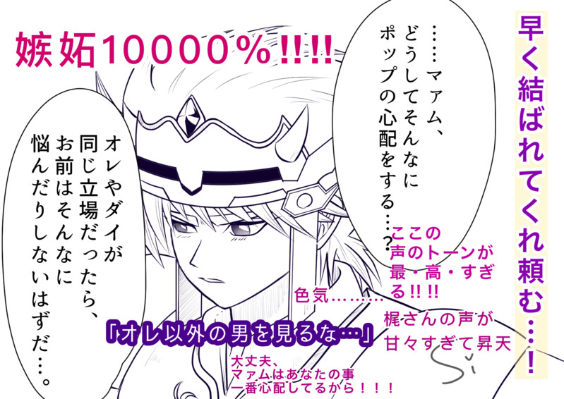 simasimadayone☆quiet followMEMO69話の衝撃がすごい…!言いたいことは山とあれど、とりあえず私の最高ポイントはここでした。 #ヒュンマ hygmma show all(+1 images) Tap to full screen (size:1518x1075).Repost is prohibited Let's send reactions! freqpopularsnackothersPayment processing Replies from the creator Follow creator you care about!☆quiet follow simasimadayonePROGRESSたまきず時空、ラーとマァムの修行クエストの続き妄想。…の、ラフ。汚くて申し訳ない…。嫉妬するヒュンケルが欲しいので引き続き頑張ります😂 6 simasimadayoneDONE妄想ヒュンマ連携技、魔弾スクライド!!ペーパーをネップリ登録しました。セブンネップリA4片面カラー60円 10/19まで。予約番号:60786726 4 simasimadayoneDONE闘志と天使の生誕祭作品。最近入浴剤を買って、ぼーっとしながら思いついた4コマ2本。もう、はやく付き合っちゃえよな!!! simasimadayoneDOODLE木ドンに嫉妬してからの床ドンはきっと情熱的。…ラーハルトが…、気になるのか……?ち、違うの、ヒュンケル…🤦🏻♀️あーーー自家発電!! simasimadayoneDOODLE最近の私の妄想ブーム、ラー、まむ、嫉妬するヒュン。恋愛感情ではなくまむが強いから興味があるラーの、木ドン🌲…という設定のプロットが大体できてしまった…。最近家族がゲームしないから、私も趣味に没頭しづらくて雑指描きばかり増える😂 simasimadayoneDONEバレンタインネタの雑落書きを清書しました。バレンタインのペーパーラリーシチュエーションヒュン編。恋のライバルはすべて蹴散らす意気込みの男。2025.7.17 related works simasimadayoneDONEHMFウィンターの為にアバター作ったんですが、ヒュンマCMができました。ドラクエにでてくるあの馬です。 2 simasimadayoneMEMOにんげんって……の、ヒュンマ的欲望全開な感想叫び。(センシティブ) simasimadayoneDONEジュンブラフェス記念に描きました!ヒュンマちゃんおめでとう🥳💜❤️せっかく描いたステンドグラス隠れ過ぎた。2024.6.26 2 下町小劇場・芳流MEMO2023.3.25魔王軍オンリーイベント「魔王軍全員集合!2」合わせサンプル「地底魔城の花嫁1」サンプル 武装を解いたヒュンケルが地底魔城の中に戻ると、そこでは、ひと騒ぎ起きていた。 「はなしてっ!!」 地底魔城の廊下で、ミイラ男がマァムを捕らえ、その腕を後ろにねじり上げていた。腕を縛って地下牢に放り込んでいたはずの人質が、いつの間にか、拘束を外し、牢の外へと出ていた。 「どうした。」 「これは、これはヒュンケル様。お騒がせして申し訳ございません。」 ヒュンケルに気付くと、モルグは丁寧に頭を下げた。 マァムもまた、彼の姿を認めると、食って掛かったように叫んだ。 「ヒュンケル! ダイは・・・ポップはどうなったの!?」 だが、ヒュンケルは、マァムの叫びを無視してモルグと会話を続けた。 「逃げられたのか。見張りはどうした。」 2983 真紀瑠唯DONEじょうじさん@jo_jo_joujiが投下されたエルゴヒュが素敵過ぎて、その後のHMFを妄想してしまいました。928号室のじょうじさんと共にHMFを見守る9階の住民設定です。夢小説のように『私』部分を脳内で置き換えてお読み下さいませ。しあわせ子沢山HMF設定の使用許可を下さったじょうじさんに感謝いたします🙏🙏🙏有難うございました!MDC伝説メゾンドカール。 最近熟年女性の転入が急増しているこのマンションで奇妙な噂が立っていた。 低層階の住民でさえ便利に利用しているエレベーターを それなりの高層に住んでいながら使っていない人が居ると。 それも複数。 どうやら同じファミリーであるらしい。 「子どもの身体を鍛えるためなのかしらね?」 「でもご夫婦も使っていないらしいわよ」 同じエレベーターに乗り合わせた『私』は これが例の噂か~ 凄い人が居るもんだなと、ぼ~と聞き耳を立てていた。 噂は更に具体的になっていく。 「それで、何階の方なの?」 「確か…9階?」 「ぶほっ!!」 え?マジ!!!???きゅーかい!? いやいや変な声を出してしまった。 上手い言い訳をしないと円滑なご近所付き合いに差し障りが…;;; 1016 simasimadayoneDONEヒュンマカーニバルVR2025記念バレンタイン女子会漫画!今回はマァムが恥ずかしがってて楽しかったです。イラストはペーパーに使ってます。このネタ温め続けて3年目、ようやく描けた😂2025.2.7 9 simasimadayoneDONE獄炎3巻末尾漫画も、ヒュンマ脳にかかればこうなっちまうんだぜ…。ロカに会わせてくれてありがとう!!! simasimadayoneDOODLEまさかの公式ソング、にんげんっていいぞ…!歌うイメージのないヒュンが歌ってる衝撃!!そうだよね聖母のお膝で眠るなら嬉しくて歌っちゃうのかもね…✨インフィニティストラッシュ発売おめでとうございます!!!2023.9.28 simasimadayoneDONE獄炎34話扉絵で情緒が……。一人じゃないよ。そばにいるよ。ずっと…。2023.9.21 recommended works 玖堂らいか@SD再燃中MAIKINGここまでの距離感になるにはまだまだ遠そうなヒュンマだなぁ。緊張した表情とかマァムがチャームされてヒュンケルに迫ってるほうがそれっぽい。相手を好きな気持ちがなければかからないチャームとかなら