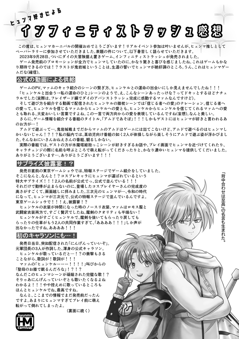 simasimadayone☆quiet followDONE2023.12.17ダズンローズ記念のヒュンマペーパーラリー作品!アップ忘れてた💦 #ヒュンマ hygmma show all(+1 images) Tap to full screen (size:4961x7016).Repost is prohibited Let's send reactions! freqpopularsnackothersPayment processing Replies from the creator Follow creator you care about!☆quiet follow simasimadayonePROGRESS続き6pぶん。とんでもねぇところまで来ました。(ラーに何言わせててるんだ)ラーは魔族的感覚の持ち主。 6 simasimadayonePROGRESSたまきず時空、ラーとマァムの修行クエストの続き妄想。…の、ラフ。汚くて申し訳ない…。嫉妬するヒュンケルが欲しいので引き続き頑張ります😂 6 simasimadayoneDONE妄想ヒュンマ連携技、魔弾スクライド!!ペーパーをネップリ登録しました。セブンネップリA4片面カラー60円 10/19まで。予約番号:60786726 4 simasimadayoneDONE闘志と天使の生誕祭作品。最近入浴剤を買って、ぼーっとしながら思いついた4コマ2本。もう、はやく付き合っちゃえよな!!! simasimadayoneDOODLE木ドンに嫉妬してからの床ドンはきっと情熱的。…ラーハルトが…、気になるのか……?ち、違うの、ヒュンケル…🤦🏻♀️あーーー自家発電!! simasimadayoneDOODLE最近の私の妄想ブーム、ラー、まむ、嫉妬するヒュン。恋愛感情ではなくまむが強いから興味があるラーの、木ドン🌲…という設定のプロットが大体できてしまった…。最近家族がゲームしないから、私も趣味に没頭しづらくて雑指描きばかり増える😂 related works 下町小劇場・芳流MEMO2023.3.25魔王軍オンリーイベント「魔王軍全員集合!2」合わせサンプル「地底魔城の花嫁1」サンプル 武装を解いたヒュンケルが地底魔城の中に戻ると、そこでは、ひと騒ぎ起きていた。 「はなしてっ!!」 地底魔城の廊下で、ミイラ男がマァムを捕らえ、その腕を後ろにねじり上げていた。腕を縛って地下牢に放り込んでいたはずの人質が、いつの間にか、拘束を外し、牢の外へと出ていた。 「どうした。」 「これは、これはヒュンケル様。お騒がせして申し訳ございません。」 ヒュンケルに気付くと、モルグは丁寧に頭を下げた。 マァムもまた、彼の姿を認めると、食って掛かったように叫んだ。 「ヒュンケル! ダイは・・・ポップはどうなったの!?」 だが、ヒュンケルは、マァムの叫びを無視してモルグと会話を続けた。 「逃げられたのか。見張りはどうした。」 2983 simasimadayoneDONEジュンブラフェス記念に描きました!ヒュンマちゃんおめでとう🥳💜❤️せっかく描いたステンドグラス隠れ過ぎた。2024.6.26 2 simasimadayoneDOODLEまさかの公式ソング、にんげんっていいぞ…!歌うイメージのないヒュンが歌ってる衝撃!!そうだよね聖母のお膝で眠るなら嬉しくて歌っちゃうのかもね…✨インフィニティストラッシュ発売おめでとうございます!!!2023.9.28 simasimadayoneDONE獄炎34話扉絵で情緒が……。一人じゃないよ。そばにいるよ。ずっと…。2023.9.21 simasimadayoneMEMOにんげんって……の、ヒュンマ的欲望全開な感想叫び。(センシティブ) 真紀瑠唯DONEじょうじさん@jo_jo_joujiが投下されたエルゴヒュが素敵過ぎて、その後のHMFを妄想してしまいました。928号室のじょうじさんと共にHMFを見守る9階の住民設定です。夢小説のように『私』部分を脳内で置き換えてお読み下さいませ。しあわせ子沢山HMF設定の使用許可を下さったじょうじさんに感謝いたします🙏🙏🙏有難うございました!MDC伝説メゾンドカール。 最近熟年女性の転入が急増しているこのマンションで奇妙な噂が立っていた。 低層階の住民でさえ便利に利用しているエレベーターを それなりの高層に住んでいながら使っていない人が居ると。 それも複数。 どうやら同じファミリーであるらしい。 「子どもの身体を鍛えるためなのかしらね?」 「でもご夫婦も使っていないらしいわよ」 同じエレベーターに乗り合わせた『私』は これが例の噂か~ 凄い人が居るもんだなと、ぼ~と聞き耳を立てていた。 噂は更に具体的になっていく。 「それで、何階の方なの?」 「確か…9階?」 「ぶほっ!!」 え?マジ!!!???きゅーかい!? いやいや変な声を出してしまった。 上手い言い訳をしないと円滑なご近所付き合いに差し障りが…;;; 1016 simasimadayoneDONE獄炎3巻末尾漫画も、ヒュンマ脳にかかればこうなっちまうんだぜ…。ロカに会わせてくれてありがとう!!! simasimadayoneDONEHMFウィンターの為にアバター作ったんですが、ヒュンマCMができました。ドラクエにでてくるあの馬です。 2 simasimadayoneDONEヒュンマカーニバルVR2025記念バレンタイン女子会漫画!今回はマァムが恥ずかしがってて楽しかったです。イラストはペーパーに使ってます。このネタ温め続けて3年目、ようやく描けた😂2025.2.7 9 recommended works simasimadayoneDONEや、やっと描けた!!55話、コア爆発時に隠れた土の中で、息ができるよう庇ったヒュンに、せめて体力だけでも回復してあげようとベホイミしてあげるシーンの捏造。 simasimadayoneDONEヒュンマフェス・ウィンター作品③【衝撃】ポップの告白を聞いた彼の脳内はこう!一度闇に染まってしまった自