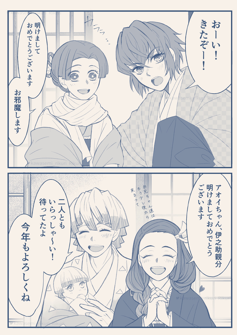 🐗夫婦と⚡️夫婦(+1)のお正月の何て事ない一コマを描いてみました。お互いのお家に行ったり来たりしてるのかなぁなんて