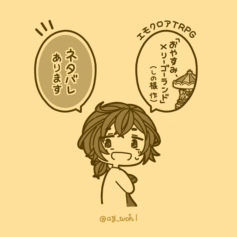 麻中よもぎ☆quiet followSPOILER※シナリオのネタバレを含む内容です。エモクロアTRPG「おやすみ、メリーゴーランド」(しの様作)を通過してきたうちの共鳴者のその後話です。共鳴者:一ヶ谷衣緒(22歳女・手先器用で人生不器用な雑貨屋バイト)ある日のバイト後のロッカー室にて。 ##TRPG #おやすみメリーゴーランド goodNightMerry-go-round. show all(+8 images) Tap to full screen (size:1536x1536).Repost is prohibited Let's send reactions! freqpopularsnackothersPayment processing Replies from the creator Follow creator you care about!☆quiet follow 麻中よもぎSPOILERCoC『マダムディアマンの忘れ物』で使用した小道具イラストです!誰ロク自陣・NumRock://イメージなサムシング。※KPが趣味で増やした盛り要素なのでシナリオ本編とは関係ない……んですが、念のため念のためでワンクッション 2 麻中よもぎSPOILERCoC『Because,Maybe』の卓中で使用したスチル絵的なサムシングです!(※人によってはネタバレの可能性があるので、念のためワンクッション) 2 麻中よもぎDOODLE【らくがき】ねこきた!その後if。NumRock://全員います(アイデアはガムみかんさんからいただきました!)※リンク先で、CoC「でかい猫とKPCが家に来た」弊卓における「ねこ」のビジュアルバレがあります(物語のネタバレはありません) 2 麻中よもぎSPOILER #らじの03 2周年ですね〜〜〜!!!という絵です。なんだかんだ三位一体な3人と、魅力いっぱいの物語に愛を込めて!※2枚目に配信内容のネタバレを含みます 2 麻中よもぎSPOILERアーカイブで見た #ハヤ栗アンノウン が賢くて軽妙で面白かった〜!というファンアートです。終始「会話」がとっても良かったな……!の気持ちを詰め込みました!※2枚目以降に配信内容のネタバレを含みます。 4 麻中よもぎSPOILERエモクロアTRPG自作シナリオ「ブランノブランク」遊んでくださってありがとうございました!!!の気持ちを込めて、第1陣〜第3陣に来てくださった共鳴者さんのファンアートを描きました!お三方!本当に!!ありがとうございました!!!※シナリオネタバレ有※イラストの内容が「厳密には本編中にないシーン」になっていますが、私が共鳴者さんを描きたかったのでこんな感じになってます(遊んだ人だけわかる話) 3 related works わたさくDOODLE nnnnnnoodderaDONE【腐向け】チャバが酔ってハ崎さんに甘えてる漫画。ハ崎さんがトイレに行くのを我慢していたりする。 4 べこDOODLEピンク色のバレンタインなヨウグズ🍫 ココノカSPOILER幻覚なので全くネタバレではないけど1072話の発言ネタ ちゃづDONE描いたやつその1※茨あん、ジュンあん 17 ちゃづDONE描いたやつその1※茨あん、ジュンあん 17 きくちゃんDOODLEサタン様犬好きかと思いきやロクサーンみたいなパターンもあるのでやっぱ人外思考なのかな~ きくちゃんDOODLEサタン様犬好きかと思いきやロクサーンみたいなパターンもあるのでやっぱ人外思考なのかな~ 2watoyoDOODLE【朝のボールペン落書き】【日楠♀】【先天性女体化】日高先輩×男装後輩サキュバス家系楠ちゃん。海編。本当に気にしてるのは。 recommended works 酸性塩分SPOILER⚠クトゥルフ神話TRPG「ソープスクール」のネタバレを含みます。狐塚せんせえすきツイ元https://twitter.com/_enbooooon_/status/1420724133051043840?s=20 4 麻中よもぎSPOILER※シナリオのネタバレを含む内容です。エモクロアTRPG「おやすみ、メリーゴーランド」(しの様作)を通過してきたうちの共鳴者のその後話です。共鳴者:一ヶ谷衣緒(22歳女・手先器用で人生不器用な雑貨屋バイト)ある日のバイト後のロッカー室にて。 9 麻中よもぎSPOILER #大悪党あんず が楽しみすぎてわくわくしてたら、 #れじの03 #らじの03 の二次創作ができました!という絵です。※遠野あんずちゃんの参加セッション、関連の感想会配信のネタバレ要素を含みます。 2 麻中よもぎSPOILER #れじの03 2周年おめでとうございます!!!という絵です!やっぱりこの物語の言葉が好きだな〜!という気持ちで描きました。※2枚目以降に配信内容のネタバレを含みます。 3 麻中よもぎSPOILERれじらじ03シャッハ、色々な方向にすごかった…!!!というテンションで描いた、「遠野あんずちゃんの休日レジャーwith賑やかなお友達」 の図です。※2枚目に #れじらじ03シャッハ #れじの03 #らじの03 #大悪党あんず のネタバレを含みます。 2 Hachi8_8888SPOILER #雪見中ソプスク の絵⚠️シナリオ、セッションネタバレ 2 まだこSPOILER地獄ヶ原斬人がいっぱいいます(アナログです)#大悪党コーサカ #大悪党あんず #大悪党刻夜 #大悪党JB #大悪党地獄ケ原さとホ #大悪党ディズム #大悪党原作者 楸【暴虐的生命体真的好好笑】夙DOODLE #❄️🌟 #まふ司有尿道play请注意孩子第一次画涩图轻点喷(基本上在对着参考画)算是mftk有生日互动的贺图密码18↑yes/no RINNGOidDOODLE0709穹落書き 3
