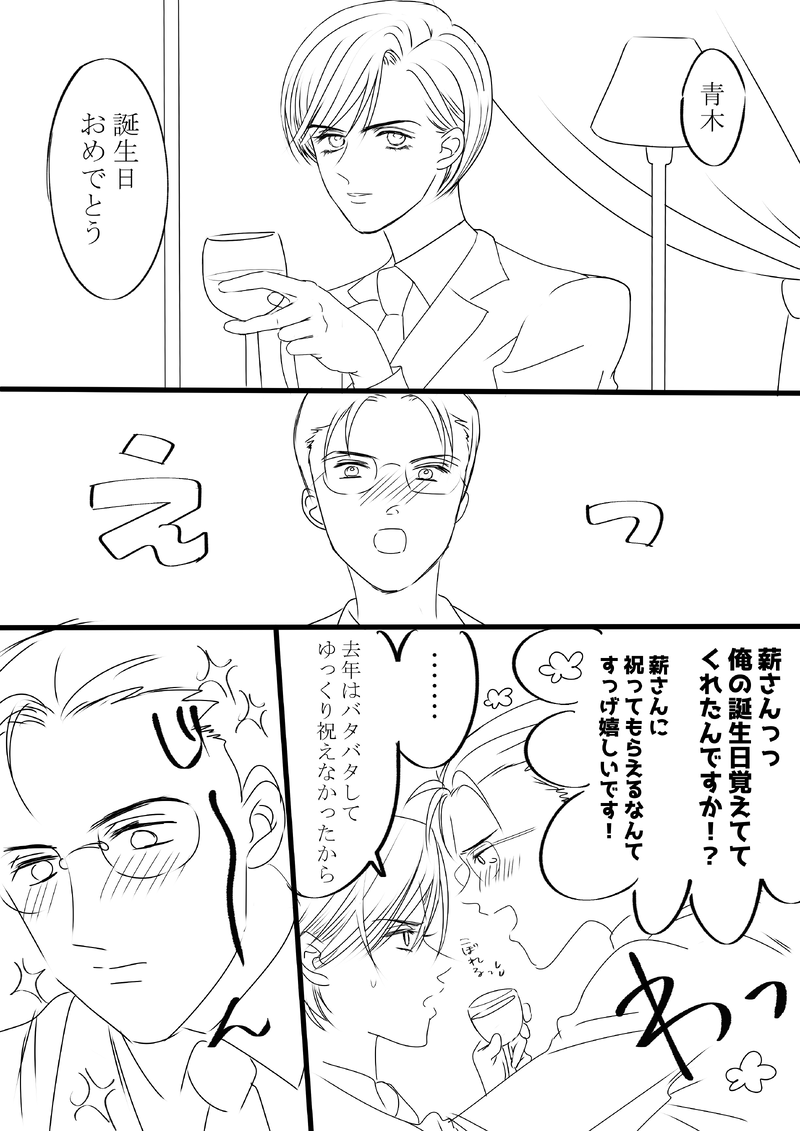 弱火で火を入れ直す鍋の傍からなかなか離れない青木に痺れを切らせ、ついにまだお腹空いてないしどうでもいい風でひとり遊びするのを忘れた薪。寂しいと気まぐれに甘えたスイッチが入ったりする。気配を消して青木の背後に回ると、腰に腕を回して抱きついた。