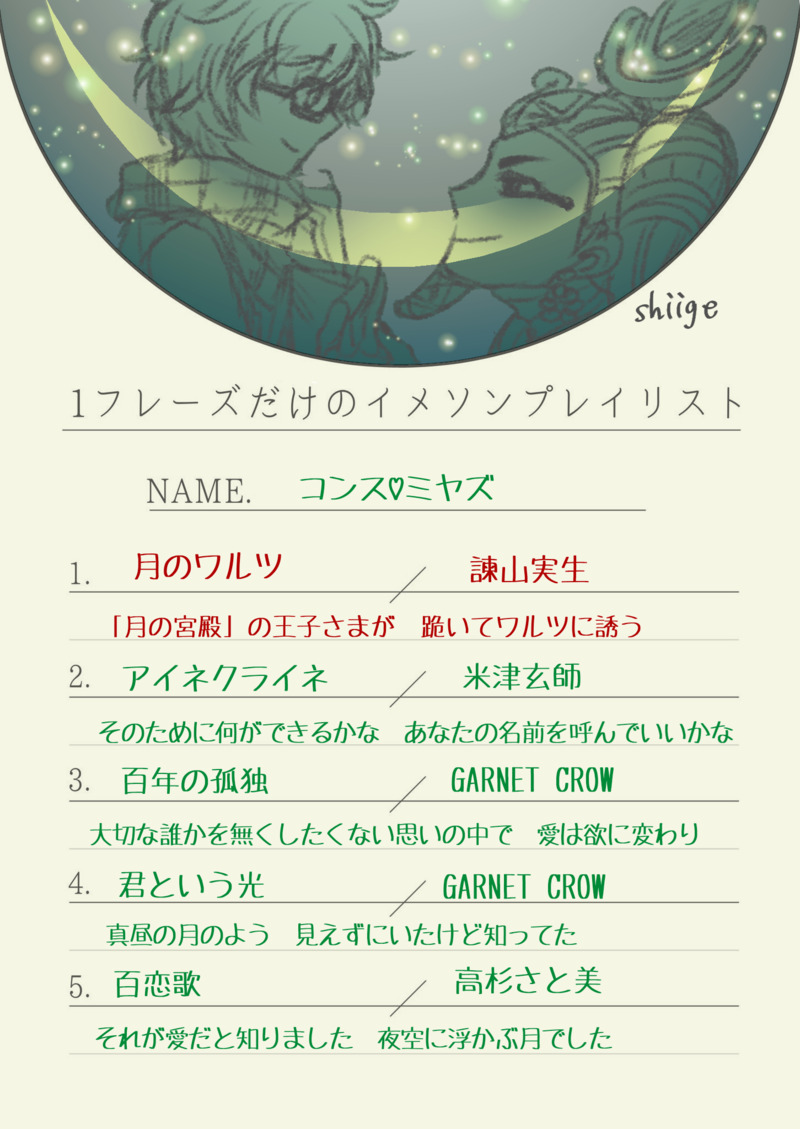 知っている曲で目につくまま見繕ってみましたが、3/5が「月」なのでこれがコンミヤのイメージ根幹なんだなぁと思いました。