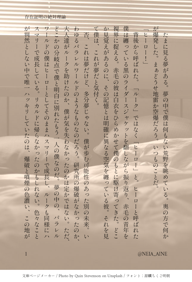 NEIA_AINE☆quiet followDONE #アロルク深夜のワンドロワンライ祭り眠気に敗北\(^o^)/でも3回目は半日遅刻で何とかやりきりました…!遅刻は変わりないので申し訳ないですが…。支部で見たhrlkが好きで雰囲気はそんな感じにしてます。どれか分からないので見つけたらTwitterのツリーで置いておこうかと思います。 #アロルク深夜のワンドロワンライ祭り show all(+4 images) Tap to full screen (size:630x928).Repost is prohibited Let's send reactions! freqpopularsnackothersPayment processing Replies from the creator Follow creator you care about!☆quiet follow NEIA_AINEDONE #アロルク深夜のワンドロワンライ祭りまずは主催者様お疲れ様でした!体調不良とのことで、ご試合くださいませ。ハンバーグ作りながらアーロンとの思い出に思いを馳せるルクです。最後のお題はどうしても全部盛りしたく時間を取りました(遅刻はいつもです)。自分なりにまた書けたらなぁと思います!ありがとうございました! 10 NEIA_AINEDONE【アロルク】ワンライ同じお題を借りて、糖度高めのものを書きました。アロ+ルクばかりになっていた最近なので猛省して今度はアロルク 4 NEIA_AINEDONE【アロルク】7月21日なので、頭の悪い下ネタの半分ギャグを書きたかった次第です。内容が全般的に酷いのでポイピク送り。 6 NEIA_AINEMOURNING【アロルク】オチが見つけられなくて、最後まで書けなかったのでお焚き上げ。タイトル読んで字のごとくです。ルークの中にもうひとりの人格がある話。また書けたらこの設定は使って書きたい。 463 NEIA_AINEDONE #アロルク深夜のワンドロワンライ祭り今回は間に合った…!「潜入服」お借りしました!最近書くのアロルクっぽくないかもしれないですが、気持ちはアロルク…。家事のできる男アーロンです。あと関係ないけど、黒光りするジャケットって黒光りするGって略せるやん…って書いてて思った…。 3 NEIA_AINEDONE #アロルク深夜のワンドロワンライ祭り眠気に敗北\(^o^)/でも3回目は半日遅刻で何とかやりきりました…!遅刻は変わりないので申し訳ないですが…。支部で見たhrlkが好きで雰囲気はそんな感じにしてます。どれか分からないので見つけたらTwitterのツリーで置いておこうかと思います。 5 related works かげるREHABILI【アロルク】残痕に触れて【お題】傷跡エンド後。ルークの身体の傷とアーロンの心の傷。#アロルク深夜のワンドロワンライ祭り 3 かえりDONE文/アロルク#アロルク深夜のワンドロワンライ祭りお題「幸福」物騒な言葉が沢山出てきます。内容はお酒でべろんべろんのルクくんが余計なことを喋りまくって、それを全部アロが聞いてあげるお話。いつもより少し物騒なアロルクこういうちょっと支離滅裂な感じを書いてみたかった…あんまり読了後の気分がスッキリしないかもしれません。それでも良い方はどうぞ 4 ながれCAN’T MAKE #アロルク深夜のワンドロワンライ祭りお題「筋トレ」「傷跡」ワンドロ初参加&遅刻失礼します🙏アーロン、ルークに自分がつけた傷以外絶対つけさせたくない…もとい、映えさせたくないマン emotokeiDONEめちゃめちゃに遅刻~!七夕 お借りしました。ゲーム終了後のお話ですバレ注意#アロルク深夜のワンドロワンライ祭り 1459 はるきDONE #アロルク深夜のワンドロワンライ祭りワンドロワンライ開催おめでとうございます!お題「傷痕」 かえりDONE文/アロルク⚠️クリア&コンプ推奨時空#アロルク深夜のワンドロワンライ祭りの、始動おめでとうございます🎉とても短いですが初回は頑張って参加したくて…!お題「後方彼氏」どうやら浮かれてるらしいアロルクとお店の店員さんたち 2 shuran_bondMOURNING #アロルク深夜のワンドロワンライ祭りルールを間違えていたので22時から慌てて書き始めたら何も考えていないすけべになった。ルークの潜入服は性的ですよね。 1505 yuenbondDONE #アロルク深夜のワンドロワンライ祭り お題「傷痕」お借りしました。本編のネタバレがあります 3 NEIA_AINEDONE #アロルク深夜のワンドロワンライ祭り今回は間に合った…!「潜入服」お借りしました!最近書くのアロルクっぽくないかもしれないですが、気持ちはアロルク…。家事のできる男アーロンです。あと関係ないけど、黒光りするジャケットって黒光りするGって略せるやん…って書いてて思った…。 3 recommended works yune_lbMAIKING池袋ウエストゲートパークマコト(アニメver) かげるREHABILI【アロルク】恋の天気は荒れ模様【お題】悪天候エンド後。#アロルク版深夜の創作60分一本勝負 3 mzzzkkkDONE『ジェスチャー・ゲーム』ワンドロに投稿したものです。ジェスチャーゲームで調べたら犬種縛りって出て来たのでつい…難易度高くない!? 3 かげるREHABILI【アロルク】誓言【お題】プロポーズエンド後。#アロルク版深夜の創作60分一本勝負 5 蒼夜海里DOODLE #アロルク深夜のワンドロワンライ祭り 【再会】奇跡はもう待たない ano1536980141TRAINING もだえPROGRESS #11 アロルク「久しぶりに会った恋人がおしゃれになっていました」バスケしようぜ 8 kouDONEエンド・オブ・ファントム後のアーロン