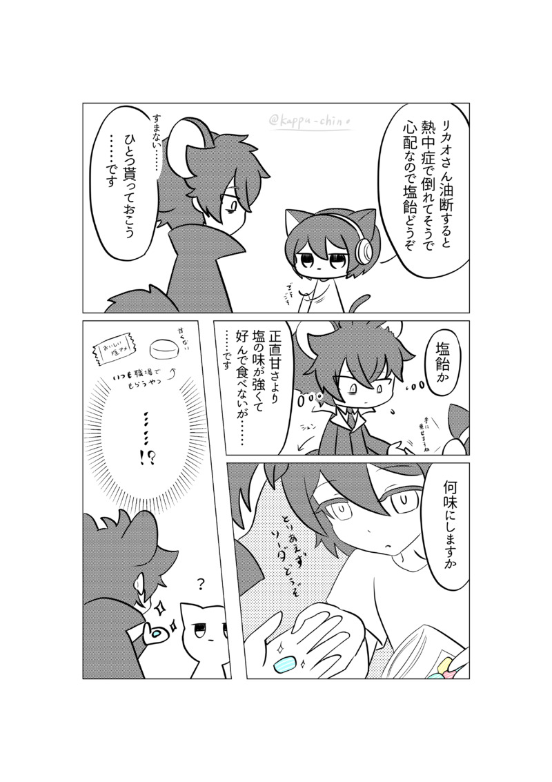 ロッカーさんがリカオさんに塩飴渡すだけの漫画です。