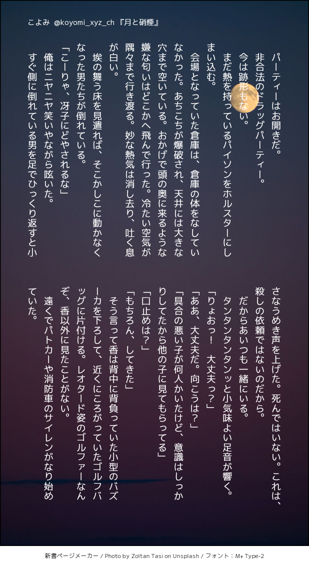 こよみんちの獠香で「硝煙」と「パーティー」のお話はどうでしょう? 9ツイート(1260字)程度だと嬉しいですっ!