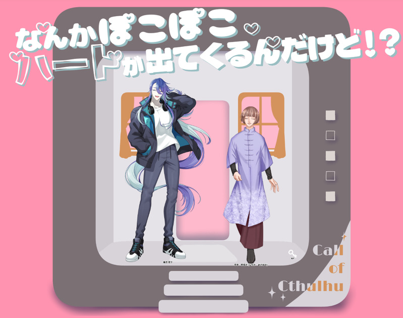 ころうさきり☆こそフォロお知らせCoC「なんかぽこぽこハートが出てくるんだけど!?」 KPC/KP:風信 雨下/虎狼さきりPC/PL:日旱 明保之/かなでさんおなそら継続で遊んできました!お付き合い始まった、おめでとうねえ。雨下は大変そうだったが明保之くんが楽しそうだったのでヨシ!遊んでいただきありがとうございました! タップで全画面(原寸:1122x886)無断転載禁止 リアクションをたくさん送って応援しよう! よく使う人気おやつその他支払処理中 作者からのリプライ 気になる人をどんどんフォローしよう!☆こそフォロ ころうさきりお知らせCoC「なんかぽこぽこハートが出てくるんだけど!?」 KPC/KP:風信 雨下/虎狼さきりPC/PL:日旱 明保之/かなでさんおなそら継続で遊んできました!お付き合い始まった、おめでとうねえ。雨下は大変そうだったが明保之くんが楽しそうだったのでヨシ!遊んでいただきありがとうございました! ころうさきりらくがきねこのひ2026 2 ころうさきりお知らせCoC「阿吽の呼吸検定試験」(KPレス)PC/PL:ノマド/もじさん漂/虎狼さきりEND:生還お隣のアイラスほいちと邂逅してきた!即席バディにしては頑張っていたと思います。システムがめっちゃ面白くて良かった。ありがとうございました! ころうさきりお知らせCoC「あなたは 入院しました」(KPレス)PC/PL:灯駅 カミーロ/虎狼さきりEND6 生還入院してきた。この男はロスト率のあるソロシに突っ込んではいけないことがよくわかりました。また怒られ案件抱えて帰ってきた……。GiGAのみんなに早く迎えに来てもらわなきゃ……。 ころうさきりらくがきはなびえ自🌸(ネタバレなし) 2 ころうさきりネタバレルーガルーげんみ× 自PCらくがき