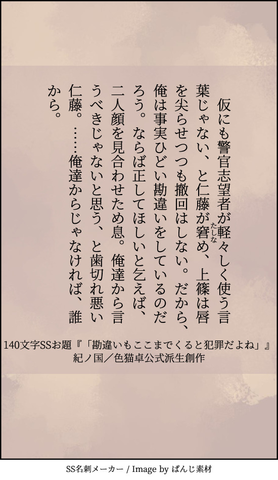 貴方は過去編たけおので『「勘違いもここまでくると犯罪だよね」』をお題にして140文字SSを書いてください。