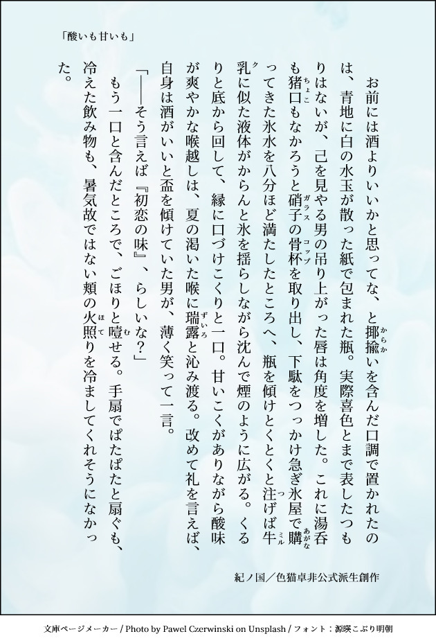 tr_imbtk☆quiet followDONE「酸いも甘いも」誠四郎さんお誕生日大正たけおのSS画像作成:文庫ページメーカー sscard.monokakitools.net色猫卓 CoC動画 非公式派生創作「株式会社アークライト」及び「株式会社KADOKAWA」が権利を有する『クトゥルフ神話TRPG』シリーズの二次創作物 ##大正たけおの Tap to full screen (size:630x928).Repost is prohibited Let's send reactions! freqpopularsnackothersPayment processing Replies from the creator Follow creator you care about!☆quiet follow tr_imbtkDONE貴方はのぎまきで『噂の二人』をお題にして140文字SSを書いてください。お題:shindanmaker.com/375517画像作成:sscard.monokakitools.net色猫卓 DX動画「Mythical Bloodline」非公式派生創作「著:矢野俊策/F.E.A.R.、KADOKAWA」が権利を有する『ダブルクロス The 3rd Edition』の二次創作作品 tr_imbtkDONE貴方は過去編たけおので『捨てられないガラクタ』をお題にして140文字SSを書いてください。お題:shindanmaker.com/375517画像作成:SS名刺メーカー sscard.monokakitools.net色猫卓 CoC動画 非公式派生創作「株式会社アークライト」及び「株式会社KADOKAWA」が権利を有する『クトゥルフ神話TRPG』シリーズの二次創作物 tr_imbtkDONE貴方はたけおので『こっちの台詞です』をお題にして140文字SSを書いてください。お題:shindanmaker.com/587150画像作成:SS名刺メーカー sscard.monokakitools.net色猫卓 CoC動画 非公式派生創作「株式会社アークライト」及び「株式会社KADOKAWA」が権利を有する『クトゥルフ神話TRPG』シリーズの二次創作物 tr_imbtkDONE貴方は大正たけおので『時々、面倒くさいけど。』をお題にして140文字SSを書いてください。お題:shindanmaker.com/587150画像作成:SS名刺メーカー sscard.monokakitools.net色猫卓 CoC動画 非公式派生創作「株式会社アークライト」及び「株式会社KADOKAWA」が権利を有する『クトゥルフ神話TRPG』シリーズの二次創作物 tr_imbtkDONE貴方は近衛兄妹で『唯一の』をお題にして140文字SSを書いてください。お題:shindanmaker.com/375517画像作成:sscard.monokakitools.net色猫卓 DX動画「Mythical Bloodline」非公式派生創作「著:矢野俊策/F.E.A.R.、KADOKAWA」が権利を有する『ダブルクロス The 3rd Edition』の二次創作作品 tr_imbtkDONEのぎまきへのお題は『欠けた愛を探してる』です。お題:shindanmaker.com/392860画像作成:sscard.monokakitools.net色猫卓 DX動画「Mythical Bloodline」非公式派生創作「著:矢野俊策/F.E.A.R.、KADOKAWA」が権利を有する『ダブルクロス The 3rd Edition』の二次創作作品 recommended works daooooooooDOODLE⚠️中文注意 4 elixiaoxiaojuc1DONE 10844 nenecon2024PAST明智親子お絵描き初心者すぎて塗り方に苦心していた… 3 grnSPUR ME遠雷プールサイド探索者予定 ばれなしワンクッション naaV777DONEめっちゃ前に描いてたラフを完成させました‼️4コマ‼️ただイチャついてる2人 nashetaniaDOODLE 推しがいいDONEまじでいつぶり 2 BCnumattaDONEセッしないと出られないボール😈×🧒 🔞 sima_sima_09DOODLE異能警察は、英雄じゃないげんみ❌非公開NPC🎄🌟⋆꙳イラスト(オタクの捏造と妄想しかないので注意)パスワード▶︎y 6