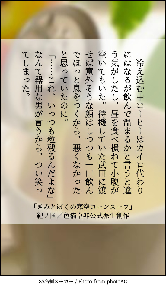 tr_imbtk☆quiet followDONE過去編たけおのSS「きみとぼくの寒空コーンスープ」画像作成:SS名刺メーカー sscard.monokakitools.net色猫卓 CoC動画 非公式派生創作「株式会社アークライト」及び「株式会社KADOKAWA」が権利を有する『クトゥルフ神話TRPG』シリーズの二次創作物 ##過去編たけおの Tap to full screen (size:550x950).Repost is prohibited Let's send reactions! freqpopularsnackothersPayment processing Replies from the creator Follow creator you care about!☆quiet follow tr_imbtkDONE貴方はのぎまきで『噂の二人』をお題にして140文字SSを書いてください。お題:shindanmaker.com/375517画像作成:sscard.monokakitools.net色猫卓 DX動画「Mythical Bloodline」非公式派生創作「著:矢野俊策/F.E.A.R.、KADOKAWA」が権利を有する『ダブルクロス The 3rd Edition』の二次創作作品 tr_imbtkDONE貴方は過去編たけおので『捨てられないガラクタ』をお題にして140文字SSを書いてください。お題:shindanmaker.com/375517画像作成:SS名刺メーカー sscard.monokakitools.net色猫卓 CoC動画 非公式派生創作「株式会社アークライト」及び「株式会社KADOKAWA」が権利を有する『クトゥルフ神話TRPG』シリーズの二次創作物 tr_imbtkDONE貴方はたけおので『こっちの台詞です』をお題にして140文字SSを書いてください。お題:shindanmaker.com/587150画像作成:SS名刺メーカー sscard.monokakitools.net色猫卓 CoC動画 非公式派生創作「株式会社アークライト」及び「株式会社KADOKAWA」が権利を有する『クトゥルフ神話TRPG』シリーズの二次創作物 tr_imbtkDONE貴方は大正たけおので『時々、面倒くさいけど。』をお題にして140文字SSを書いてください。お題:shindanmaker.com/587150画像作成:SS名刺メーカー sscard.monokakitools.net色猫卓 CoC動画 非公式派生創作「株式会社アークライト」及び「株式会社KADOKAWA」が権利を有する『クトゥルフ神話TRPG』シリーズの二次創作物 tr_imbtkDONE貴方は近衛兄妹で『唯一の』をお題にして140文字SSを書いてください。お題:shindanmaker.com/375517画像作成:sscard.monokakitools.net色猫卓 DX動画「Mythical Bloodline」非公式派生創作「著:矢野俊策/F.E.A.R.、KADOKAWA」が権利を有する『ダブルクロス The 3rd Edition』の二次創作作品 tr_imbtkDONEのぎまきへのお題は『欠けた愛を探してる』です。お題:shindanmaker.com/392860画像作成:sscard.monokakitools.net色猫卓 DX動画「Mythical Bloodline」非公式派生創作「著:矢野俊策/F.E.A.R.、KADOKAWA」が権利を有する『ダブルクロス The 3rd Edition』の二次創作作品