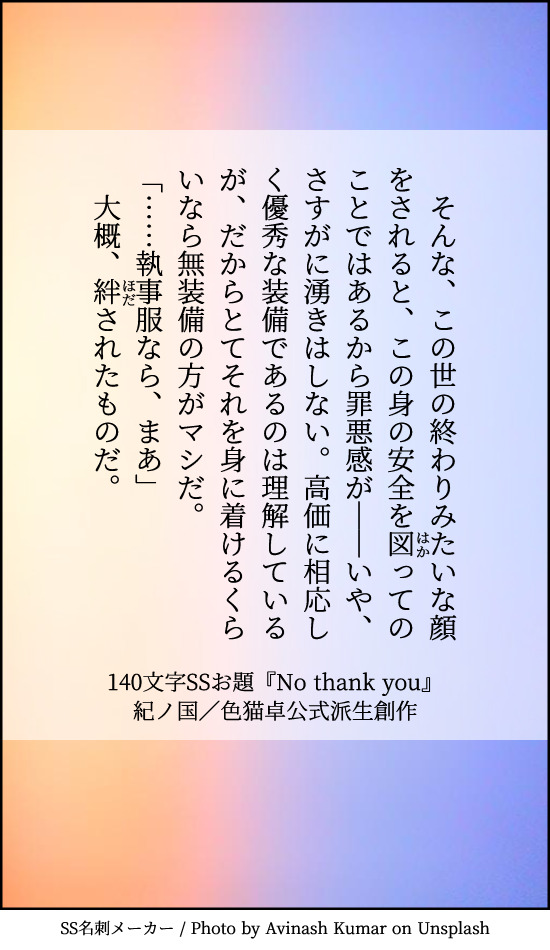 貴方はのぎまきで『No thank you』をお題にして140文字SSを書いてください。