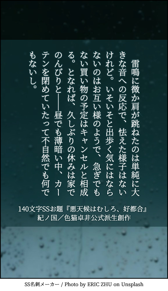 貴方は過去編たけおので『悪天候はむしろ、好都合』をお題にして140文字SSを書いてください。