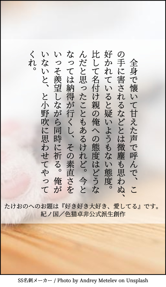 たけおのへのお題は『好き好き大好き、愛してる』です。