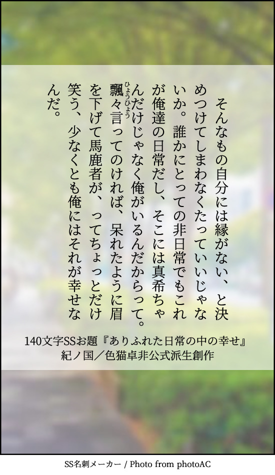 貴方はのぎまきで『ありふれた日常の中の幸せ』をお題にして140文字SSを書いてください。