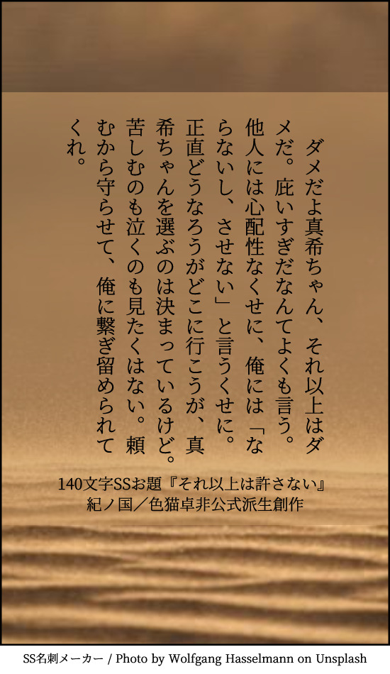 貴方はのぎまきで『それ以上は許さない』をお題にして140文字SSを書いてください。