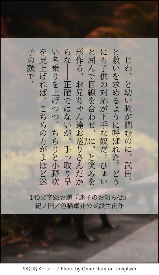 貴方は過去編たけおので『迷子のお知らせ』をお題にして140文字SSを書いてください。
