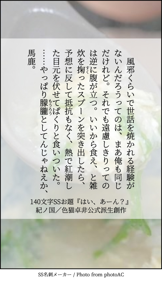 貴方は過去編たけおので『はい、あーん?』をお題にして140文字SSを書いてください。