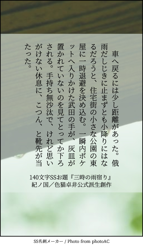 貴方は過去編たけおので『三時の雨宿り』をお題にして140文字SSを書いてください。