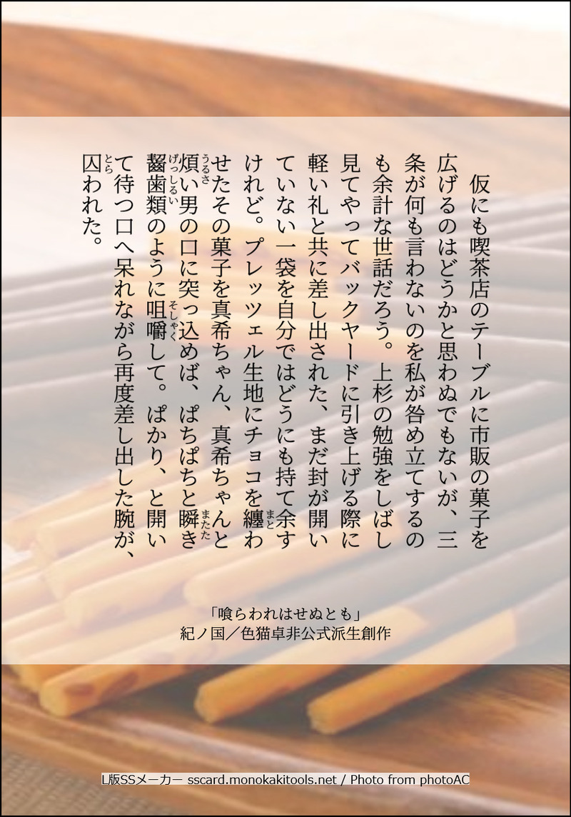 tr_imbtk☆quiet followDONE「喰らわれはせぬとも」例の日のぎまき。色猫卓 DX動画「Mythical Bloodline」非公式派生創作「著:矢野俊策/F.E.A.R.、KADOKAWA」が権利を有する『ダブルクロス The 3rd Edition』の二次創作作品 ##のぎまき Tap to full screen (size:954x1365).Repost is prohibited Let's send reactions! freqpopularsnackothersPayment processing Replies from the creator Follow creator you care about!☆quiet follow tr_imbtkDONE貴方はのぎまきで『噂の二人』をお題にして140文字SSを書いてください。お題:shindanmaker.com/375517画像作成:sscard.monokakitools.net色猫卓 DX動画「Mythical Bloodline」非公式派生創作「著:矢野俊策/F.E.A.R.、KADOKAWA」が権利を有する『ダブルクロス The 3rd Edition』の二次創作作品 tr_imbtkDONE貴方は過去編たけおので『捨てられないガラクタ』をお題にして140文字SSを書いてください。お題:shindanmaker.com/375517画像作成:SS名刺メーカー sscard.monokakitools.net色猫卓 CoC動画 非公式派生創作「株式会社アークライト」及び「株式会社KADOKAWA」が権利を有する『クトゥルフ神話TRPG』シリーズの二次創作物 tr_imbtkDONE貴方はたけおので『こっちの台詞です』をお題にして140文字SSを書いてください。お題:shindanmaker.com/587150画像作成:SS名刺メーカー sscard.monokakitools.net色猫卓 CoC動画 非公式派生創作「株式会社アークライト」及び「株式会社KADOKAWA」が権利を有する『クトゥルフ神話TRPG』シリーズの二次創作物 tr_imbtkDONE貴方は大正たけおので『時々、面倒くさいけど。』をお題にして140文字SSを書いてください。お題:shindanmaker.com/587150画像作成:SS名刺メーカー sscard.monokakitools.net色猫卓 CoC動画 非公式派生創作「株式会社アークライト」及び「株式会社KADOKAWA」が権利を有する『クトゥルフ神話TRPG』シリーズの二次創作物 tr_imbtkDONE貴方は近衛兄妹で『唯一の』をお題にして140文字SSを書いてください。お題:shindanmaker.com/375517画像作成:sscard.monokakitools.net色猫卓 DX動画「Mythical Bloodline」非公式派生創作「著:矢野俊策/F.E.A.R.、KADOKAWA」が権利を有する『ダブルクロス The 3rd Edition』の二次創作作品 tr_imbtkDONEのぎまきへのお題は『欠けた愛を探してる』です。お題:shindanmaker.com/392860画像作成:sscard.monokakitools.net色猫卓 DX動画「Mythical Bloodline」非公式派生創作「著:矢野俊策/F.E.A.R.、KADOKAWA」が権利を有する『ダブルクロス The 3rd Edition』の二次創作作品
