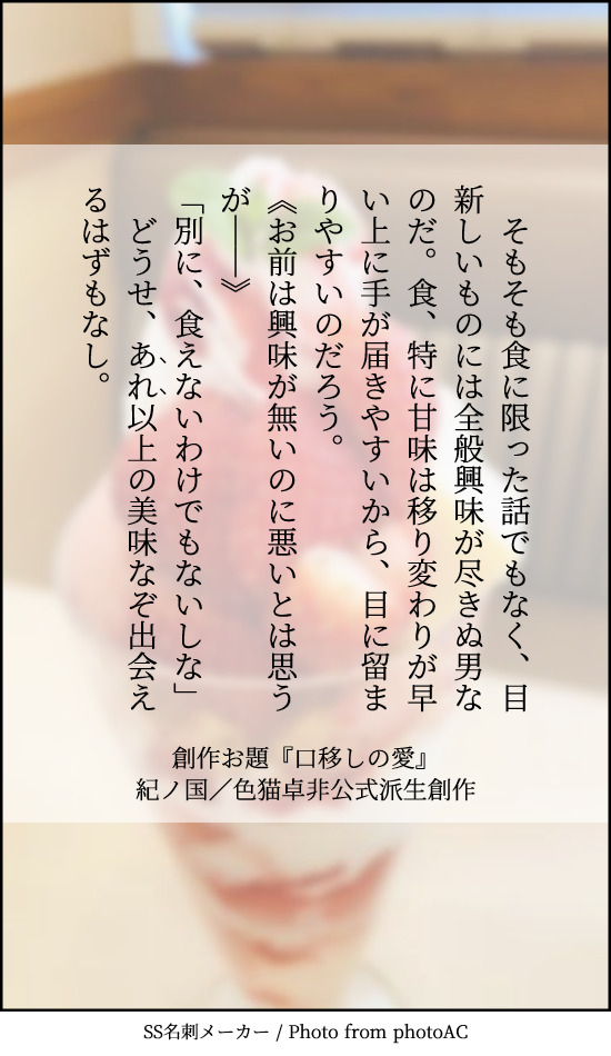 大正たけおのへのお題は『口移しの愛』です。