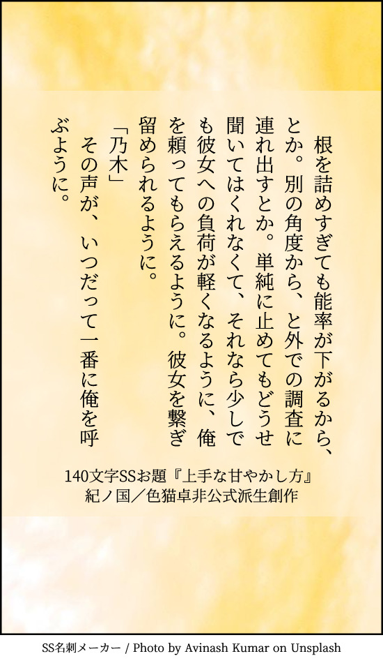 貴方はのぎまきで『上手な甘やかし方』をお題にして140文字SSを書いてください。