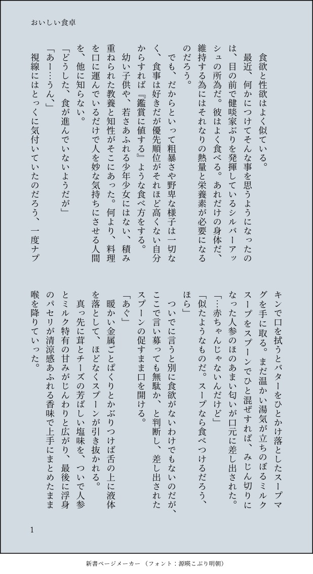 C68hcp☆quiet followDONE銀博♂でごはん。ツイッターでいつも元気をいただいている推し字書き様の為に書きました。みんなお疲れ様です。フォロワーさん(推し)、銀博関係無くても、いつまでも健やかに錯乱してて💊 show all(+2 images) Tap to full screen (size:618x1132).Repost is prohibited Let's send reactions! freqpopularsnackothersPayment processing Replies from the creator Follow creator you care about!☆quiet follow C68hcpDONE弊博(情緒二歳児♂)の銀博です。えっちな銀博祭2023さんに全然間に合わなかっ…遅刻シマシタ。やっぱり仲良し()してるだけです。 8 C68hcpDONE弊社の情緒二歳児博♂と銀灰が仲良し()しているだけな話です。えっちな銀博祭2023を祝しまして!ワッショイ! 8 C68hcpDONE銀博♂でハロウィン。創作博注意。途中までですがキリがいいので 6 C68hcpDONE付き合ってない銀博♂の博とヴァレス。🏔イベの谷地に行った後ぐらいで、幕間ではこんな感じだったかもしれない……という妄想です。※ネタバレのつもりはないけどネタバレかもしれないのでワンクッション 8 C68hcpDONE銀博♂。🏔が来たら無事でいられる自信がない。危機契約『蛮鱗』の時の話です。捏造過多。 9 C68hcpDONE銀博♂で5月中に間に合わなかったメイド…?メイドのような何かです。笑って許せる人向け 12 recommended works C68hcpDONE銀博♂。ツイッターの素敵な企画に参加させていただきました。#2021銀博ジューンブライド 4 C68hcpPROGRESS銀博♂です。創作博&独自設定強め。サークル名:fullerene(フラーレン)で9/20開催のアクナイwebオンリー『ノアの休日』にサークル参加させて頂いております。作品公開の仕方は未定ですが、一応こんな感じという事で。 19 sasaya38231DONE銀博♂ 創作男博顔出しあります。すでに出来上がってるいつもの二人です。幻覚捏造ご注意ください。いちゃいちゃ痴話喧嘩とよくあるの描きたかっただけです。#2021銀博ジューンブライド 6 C68hcpDONE銀博♂。ツイッターの素敵な企画に参加させていただきました。その2。結婚かどうかはちょっと微妙。#2021銀博ジューンブライド 4 C68hcpDONE銀博♂。ツイッターの素敵な企画に参加させていただきました。その3。むずかしい話はいいから銀博結婚しよ?#2021銀博ジューンブライド 9 しじょーDONE銀博(♂)2022年2月22日ハイパー猫の日のにゃんにゃん。以前書いたフェリーンになる話の続き。ガチャは程々に。 8 C68hcpDONE弊博(情緒二歳児♂)の銀博です。えっちな銀博祭2023さんに全然間に合わなかっ…遅刻シマシタ。やっぱり仲良し()してるだけです。 8 uwoDONE💙❤ 開催おめでとうございます🎉 2 みょうがDOODLE若城11