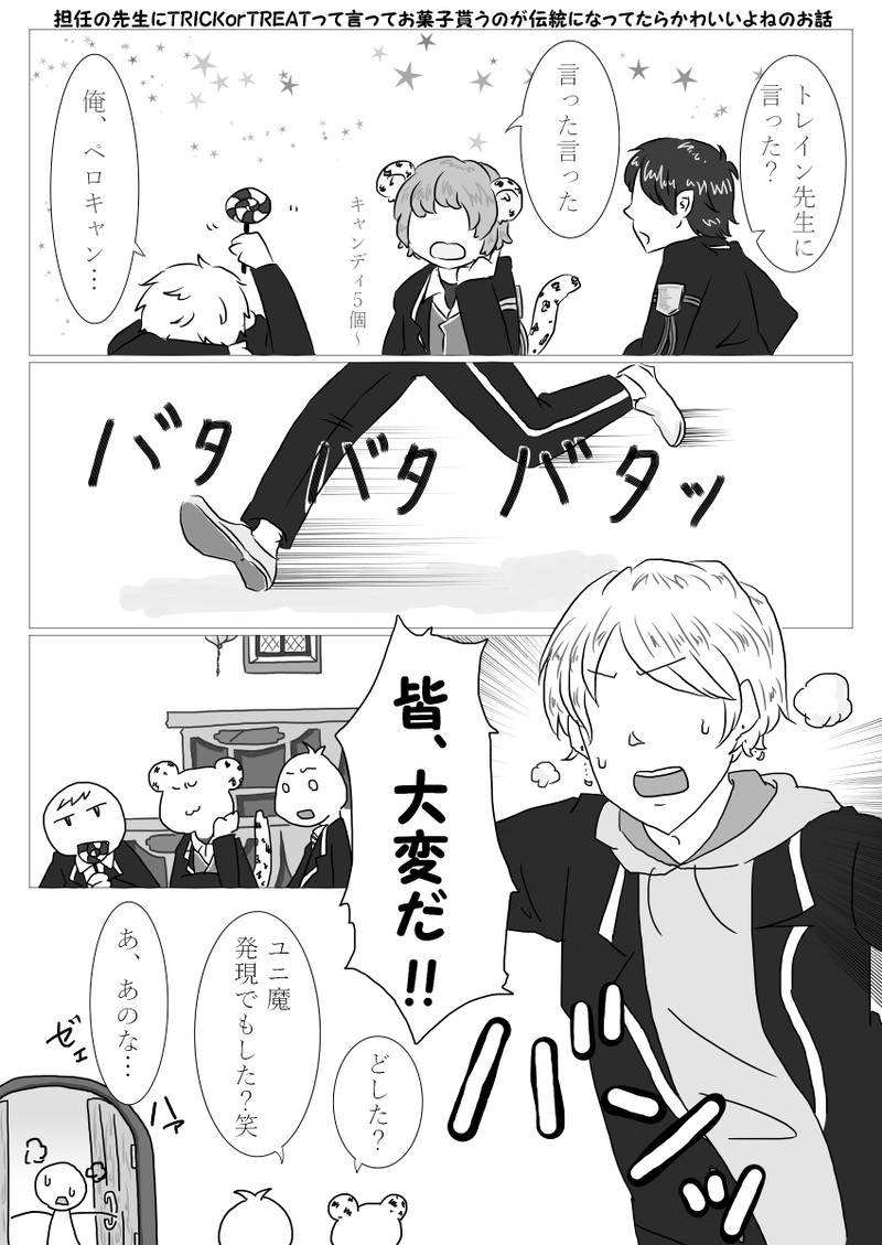 ハロウィンで、担任の先生からお菓子を貰うのが恒例になっていたらかわいいな…と思ったところからのトレイン先生クラスのモブ生徒くんのお話。私もお菓子を貰いに行きたい。