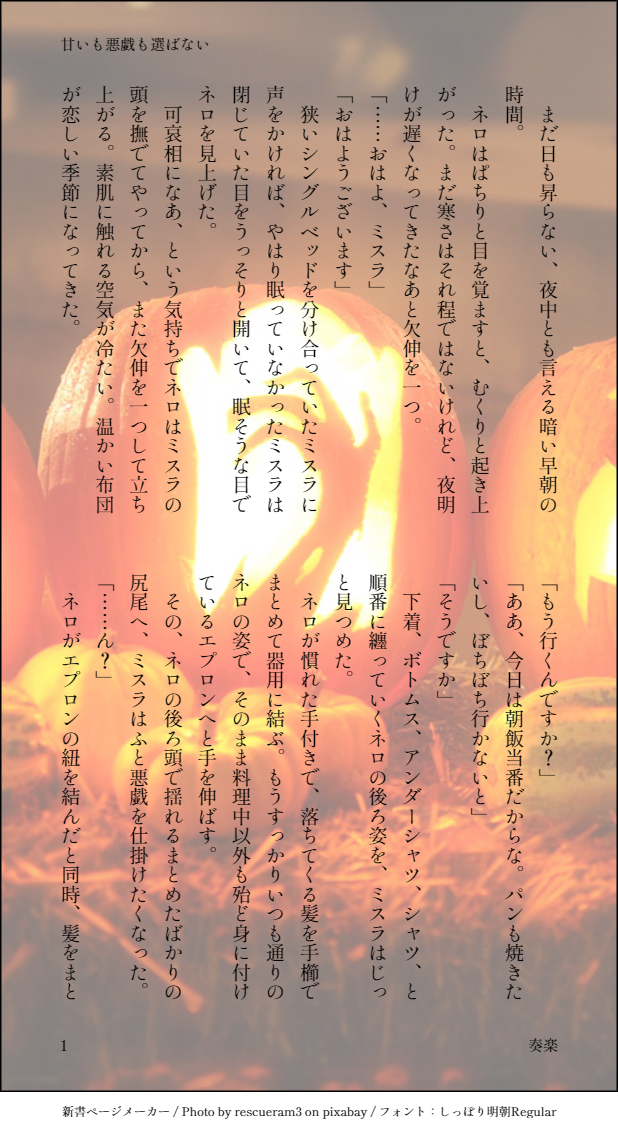 奏楽(そら)☆quiet followDONEミスネロワンライ・お題「悪戯」 ##ミスネロ show all(+3 images) Tap to full screen (size:618x1132).Repost is prohibited 奏楽(そら)DONEブラネロワンライ・お題「熱」「強がり」「近くて遠い」 4 奏楽(そら)DONEブラネロワンライ・お題「飯屋」「こっちを見て」 6 奏楽(そら)DONEファウネロワンライ・お題「ご褒美」 4 奏楽(そら)DONEファウネロワンライ・お題「叱る」「そばにいて」 7 奏楽(そら)DONEミスネロワンライ・お題「共同作業」 6 奏楽(そら)DONEブラネロワンライ・お題「突然」「それは反則」 5