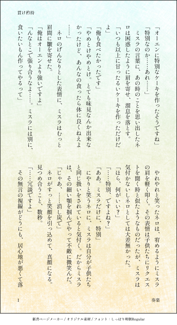奏楽(そら)☆quiet followDONEミスネロワンライ・お題「特別」 ##ミスネロ show all(+3 images) Tap to full screen (size:618x1132).Repost is prohibited 奏楽(そら)DONEブラネロワンライ・お題「熱」「強がり」「近くて遠い」 4 奏楽(そら)DONEブラネロワンライ・お題「飯屋」「こっちを見て」 6 奏楽(そら)DONEファウネロワンライ・お題「ご褒美」 4 奏楽(そら)DONEファウネロワンライ・お題「叱る」「そばにいて」 7 奏楽(そら)DONEミスネロワンライ・お題「共同作業」 6 奏楽(そら)DONEブラネロワンライ・お題「突然」「それは反則」 5 recommended works __Sattva__TIRED何だかもう続きを描かない気がする...... black10kiaDONE⚠️局部は出てませんが裸体なので注意⚠️いつかに出されたaんaんの表紙ガチャを見て脳が焼かれた末に描いた“纏う色気”“魅了する人の秘密”の表紙ワスです。何度も「こんなのワスじゃない…!パリン!こんな顔ワスはしない……!!パリン!」などと、気難しい陶芸家のように描いては投げ、描いては投げを繰り返しここまできてしまいました。。。こちらで一旦ステイさせていただいて。これにて。 ハニワDOODLE三章クリアしたら描きたくなった蔵っち🍀ヘブバン好きなカプが無限に増えていく…! あーにゃんDOODLECOC「死生騒に夏」KP:あーにゃんPL:MJさんとある家継続で行ってきました!冬に行く夏シって良いよな〜!そしてやっぱりこういうシナリオ似合うねこの2人 kurogorororoDOODLE学パロ落書きよその子メイさん(@maygoro_ff14) 2 aoi_No045DONEワンライさんで連載形式で書かせて頂いた『dbi2周目を終えて帰って来たパーバソがなかなかパーバソにならない馴れ初め話』のようやくパーバソになった回のR18部分です。前半受け優位後半攻め優位で進みます。11話はこちら→https://x.com/aoi_no045/status/1873357380223951345?s=46&t=F1_Z1uTgJGybj7m7ocu07Qpass→y 11214 pompomniumDOODLE原書感想⑭!まだ読み終わってないけど次回ラストだ!! zuxtuku81DOODLE自分用のフロスティ絵のまとめ もう少し数出てきたらピクシブにUP 2 🌸有也PAST笑顔の君が隣に居るだけで、こんなにも温かい