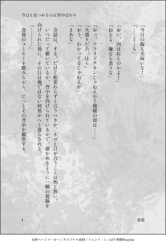 奏楽(そら)☆quiet followDONEブラネロワンライ・お題「飯屋」「こっちを見て」 ##ブラネロ show all(+5 images) Tap to full screen (size:630x928).Repost is prohibited 奏楽(そら)DONEブラネロワンライ・お題「熱」「強がり」「近くて遠い」 4 奏楽(そら)DONEブラネロワンライ・お題「飯屋」「こっちを見て」 6 奏楽(そら)DONEファウネロワンライ・お題「ご褒美」 4 奏楽(そら)DONEファウネロワンライ・お題「叱る」「そばにいて」 7 奏楽(そら)DONEミスネロワンライ・お題「共同作業」 6 奏楽(そら)DONEブラネロワンライ・お題「突然」「それは反則」 5 recommended works 朱羽613DOODLEFUTURE⑩?ようやく出たよスーツなアクスタが!!!感謝〜!!!自引き出来るかわからないので、とりあえずミニで描いてみた。笑+友達の推し……うーーん似ない! 2 おたまDOODLEプニすけかわいかった(*'▽') おたまDOODLEブルーロックは糸師兄弟が推しです 2 310(さとう)MEMO250212三島ぷち遠征‐2ぶたさんもいたよぉ昔の暮らしの道具もおもしろかったねおいしいものも食べたよ三島コロッケはお写真撮る前に食べ終わっちゃったラストは地元でのお疲れごはん楽しいぷち遠征でしたん 11 tsubasa_tkmrPROGRESSゆっくり進めてる のん🐰DONE-プリンセスに口づけを- しん・アナログ練習TRAINING2025.1.131/12分https://www.posemaniacs.com/ja/tools/viewer/poses/01HBSZ7AYFBHVFB9NWZP8JK3D51/13分https://www.posemaniacs.com/tools/viewer/poses/01GKNY0RMXBBHRVVXF7CNPH87Z 7 suimikyonDOODLE過去絵発掘しました hi_ho_00111DOODLE年末からずっと軍師に囚われてる…こなもんさんが良すぎて…!!!