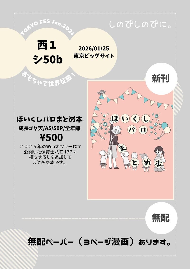 shino☆こそフォロお品書き2026年1月25日(東京)TOKYO FES Jan.2026内コロコロ作品オンリー【おもちゃで世界征服!】にて頒布する『ほいくしパロまとめ本』(ゴク天)のお品書きとサンプルです。公開分はこちらになります。→https://poipiku.com/2461466/11392848.html 通販はイベント後に会場からBOOTH倉庫へ送る予定なので入荷完了次第追ってご連絡します。 すべて表示(+5枚) タップで全画面(原寸:1414x2000)無断転載禁止 リアクションをたくさん送って応援しよう! よく使う人気おやつその他支払処理中 作者からのリプライ 気になる人をどんどんフォローしよう!☆こそフォロ shinoらくがき完全版2巻描きおろしネタ shinoらくがき公式イラリクから派生の正月ネタ shinoらくがきTOKYO FES Jan.2026内【おもちゃで世界征服!】で配布してた無配漫画。第一話後にいったん去ってまた改めて5年2組にやってきたとかそんな感じで一つ…(入れ忘れてた注釈) 4 shinoお品書き2026年1月25日(東京)TOKYO FES Jan.2026内コロコロ作品オンリー【おもちゃで世界征服!】にて頒布する『ほいくしパロまとめ本』(ゴク天)のお品書きとサンプルです。公開分はこちらになります。→https://poipiku.com/2461466/11392848.html 通販はイベント後に会場からBOOTH倉庫へ送る予定なので入荷完了次第追ってご連絡します。 6 shinoらくがきキスの日の突発漫画キスしないと出れない部屋です。小学生ゴク天です。ウソもとんちも無いです。楽しめる方のみどうぞ。 3 shinoらくがきメイド天子ちゃん。2枚目は雑過ぎるパラレル妄想とらくがきです 2 おすすめ作品 藍@雑多らくがき⚠真最終回後⚠モブ男がいます何かを自覚したかもしれない天子ちゃん 4 Shinonome_sharkできた~ウソゴク絵まとめ8月号~ゴク天は夏が似合う!(多分どの季節にも言う) 5 Shinonome_sharkできた~ウソゴク絵まとめ11月号~※年齢操作有り同人誌表紙絵を含みます!原稿進捗絵は入れていません~この時はゴク天以外を描く余裕がなかったので、2.4.6枚目は原稿に直接描いたのをトリミングして木曜に投稿していました…。毎日何かしら作業していた思い出。大変だったけど楽しかった…!! 6 Shinonome_sharkできた中学生ゴク天まんが※年齢操作多分教室には二人だけです。 2 74_negaiboshiできた成長ifできてるゴク天。ウソバテの治し方。パスはゴク天を数字で。人間界でそんな雰囲気になっても地獄と通信できるネクタイ外さないかもしれないけどそしたら着衣か裸ネクタイになってしまうね…どうしたらいいんだろうか yuchiらくがき積極的な天子ちゃんもいいなぁって..... あ。雑多らくがき🍑🌙 松月練習、しかもアナログ、下手です。パスワードはー…また決めときます←は? 5 Be03_TouRouできた『待ち遠しいね』良い夫婦の日※🎀ちゃん成人&妊娠してる👅🎀。※👅くんの見た目はいつも通り。一応ワンクッション。今描いてる原稿のどっかで差し込みます。 A08かけねえ